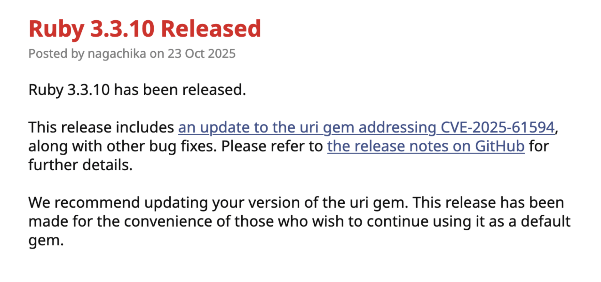 π nagachika announced the release of a new Ruby version β Ruby 3.3.10
