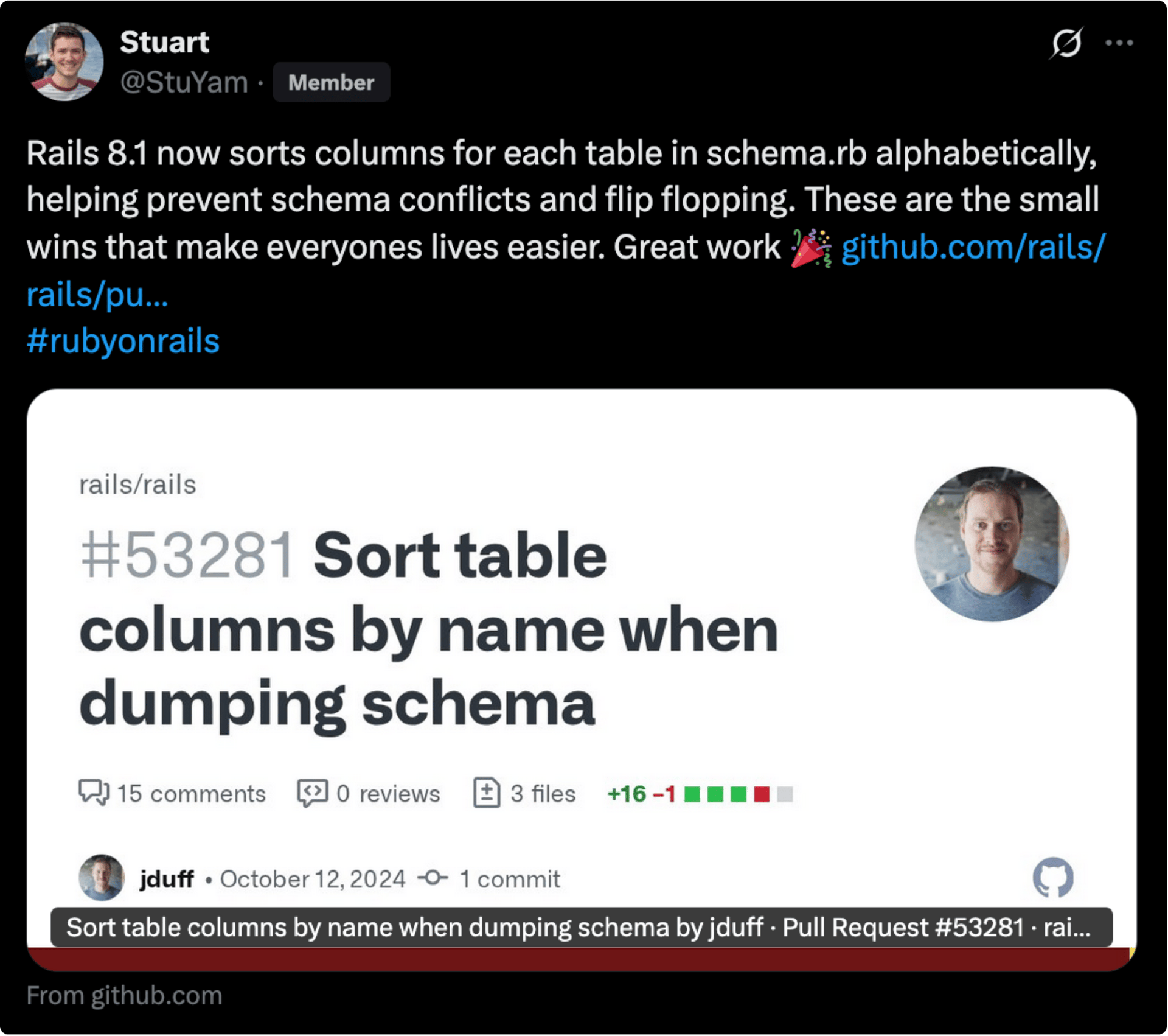 οΈπ Stuart shared that Rails 8.1 sorts columns for each table in schema.rb alphabetically