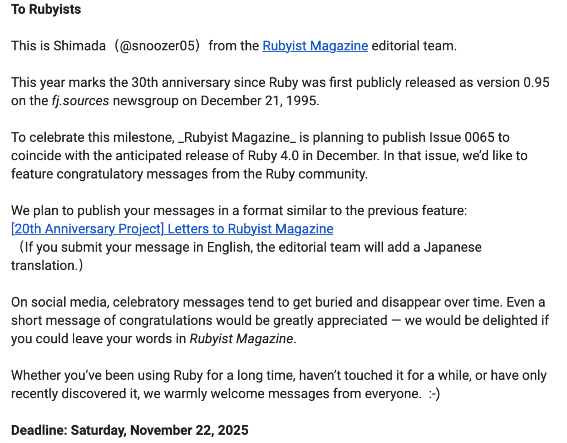 π Yukihiro Matz shared the Ruby 30th Anniversary β Message Submission Form