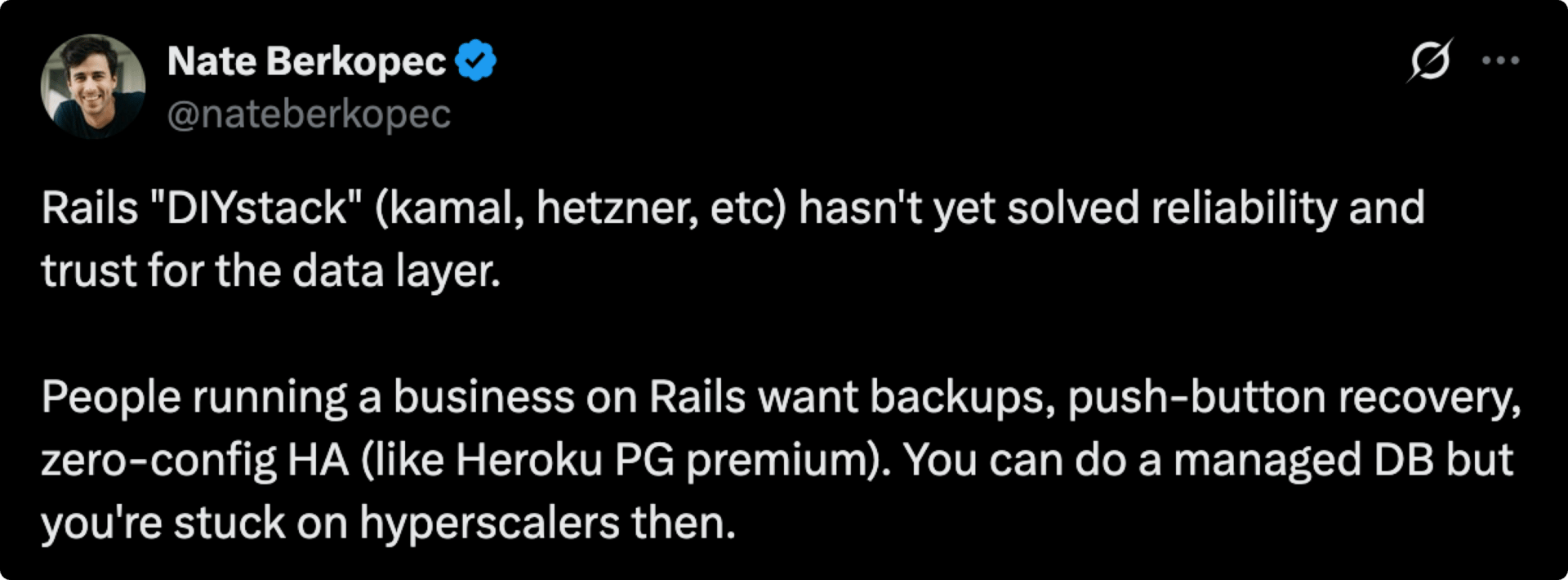 π Nate Berkopec posted that Rails βDIYstackβ hasnβt yet solved some issues from the data layer