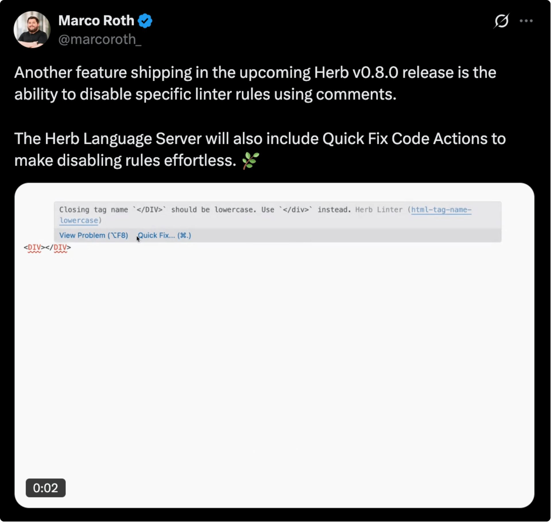 π‘ Marco Roth posted about a new feature that will be available in Herb β disable specific linter rules using comments