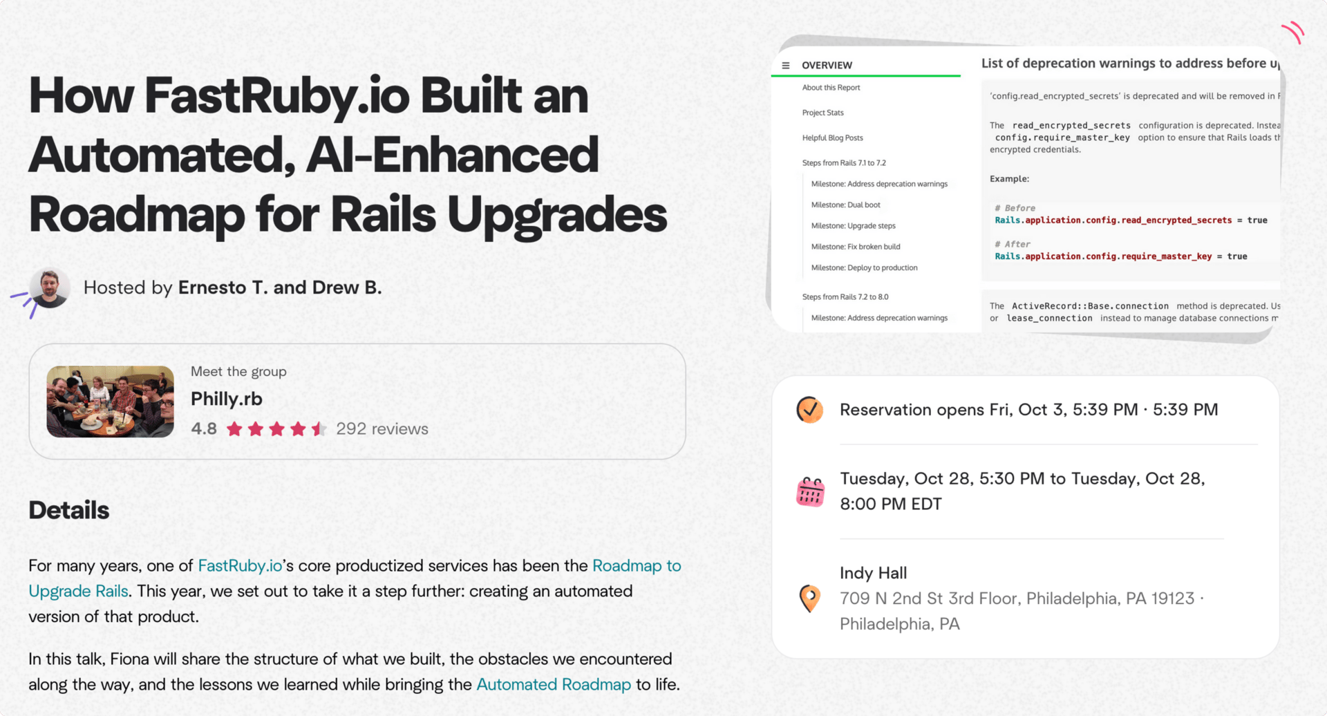 π Drew Bragg announced a new meetup β βHow FastRuby.io Built an Automated, AI-Enhanced Roadmap for Rails Upgradesβ. Hurry up and book your place here β Philly.rb 2025