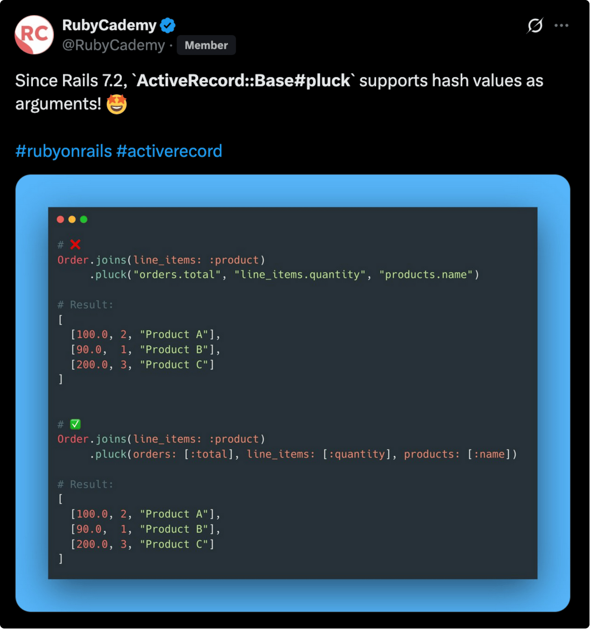 οΈπ» Ruby Cademy shared how ActiveRecord::Base#pluck supports hash values as arguments