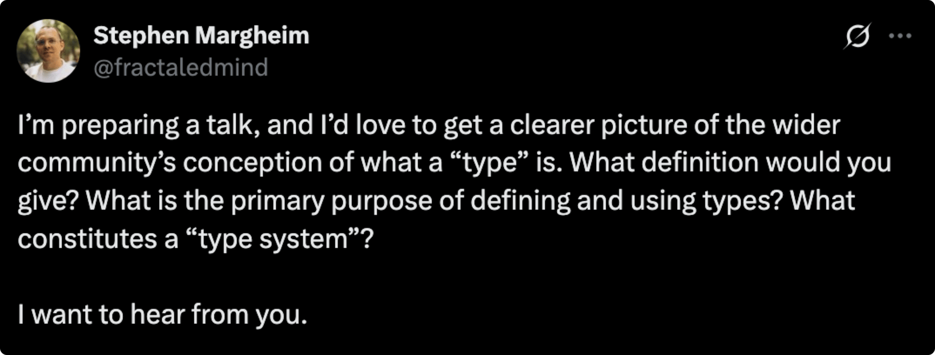 οΈπ Stephen Margheim shared he is preparing a talk about the definition of a βtypeβ, addressing some questions to his community
