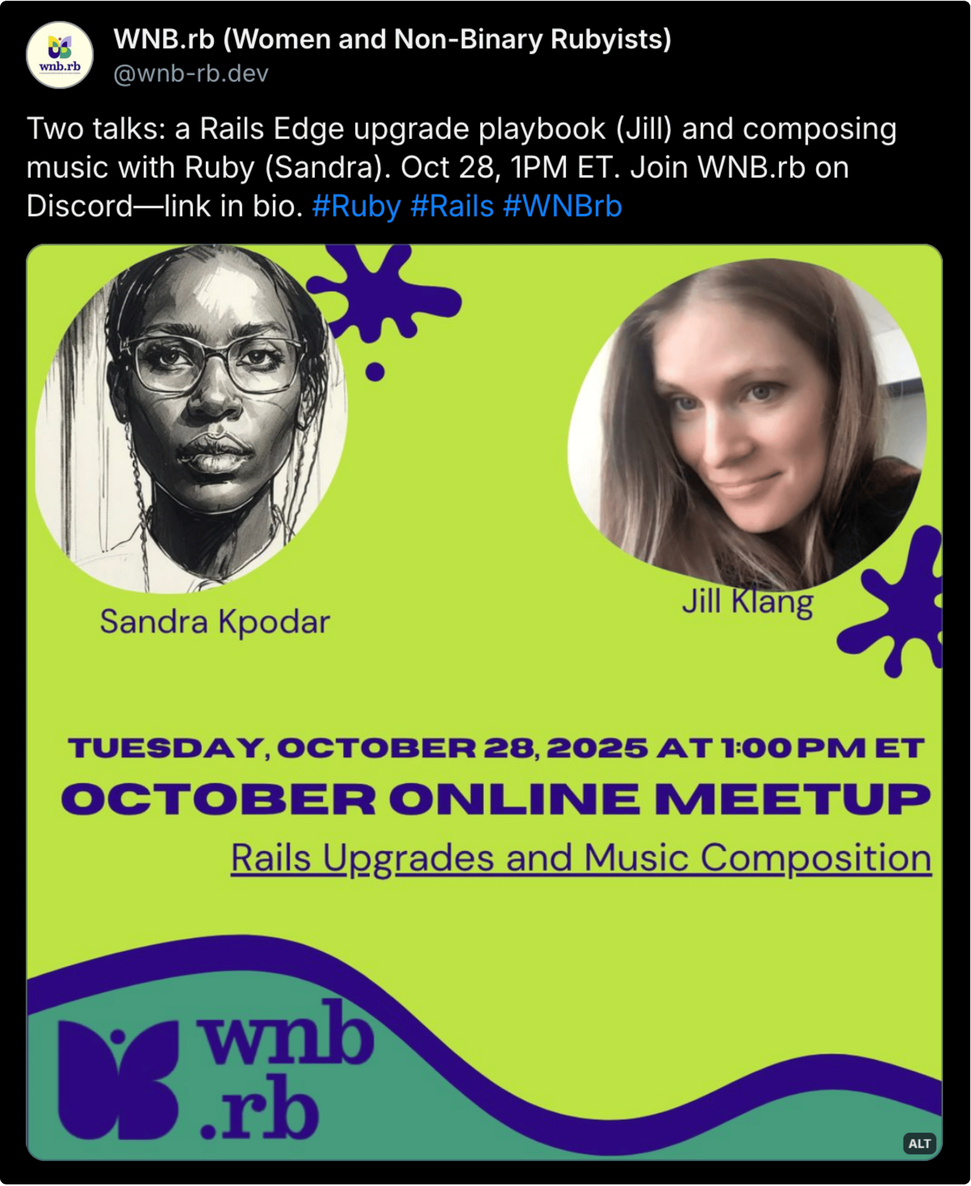 π WNB.rb (Women and Non-Binary Rubyists) announced a new online event β Rails Upgrades and Music Composition. Join the Discord community to be part of this event β WNB.rb Discord