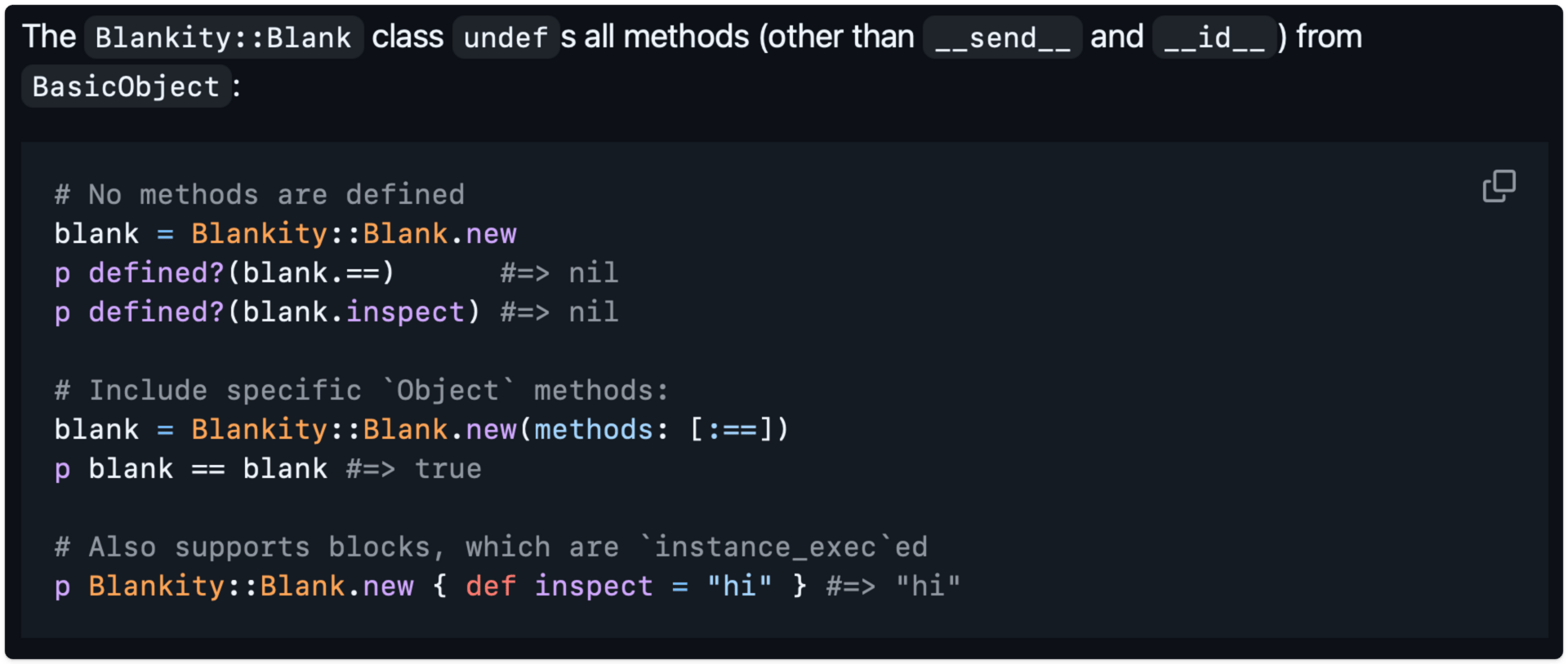 π Sam Westerman published a new gem blankity - "There's a lot of conversion methods in Ruby: to_s, to_a, to_i, etc. This gem provides types which only respond to these conversion methods, and nothing else. "