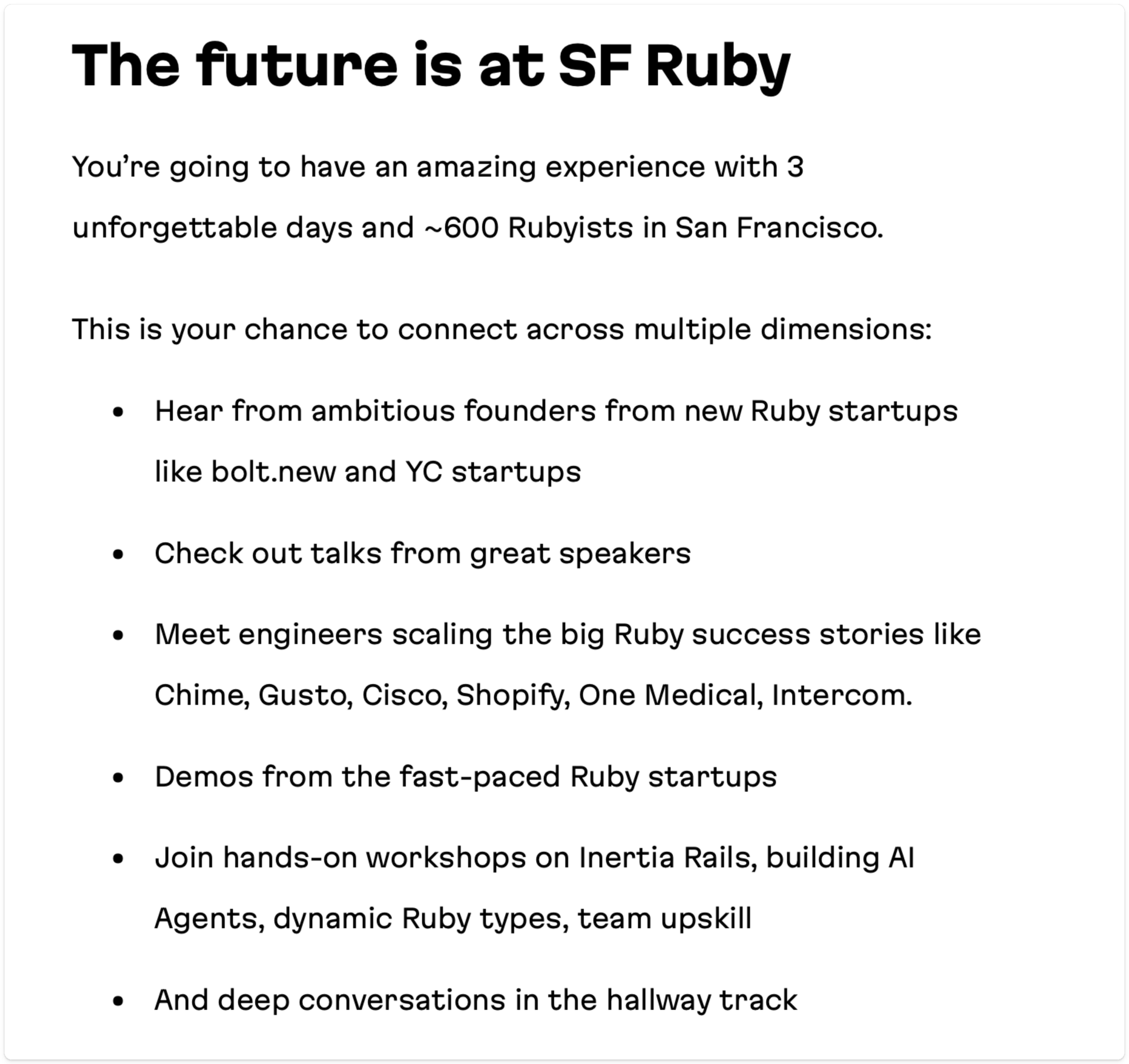 π SFRuby is happening in less than 1 month. Buy your ticket at sfruby.com