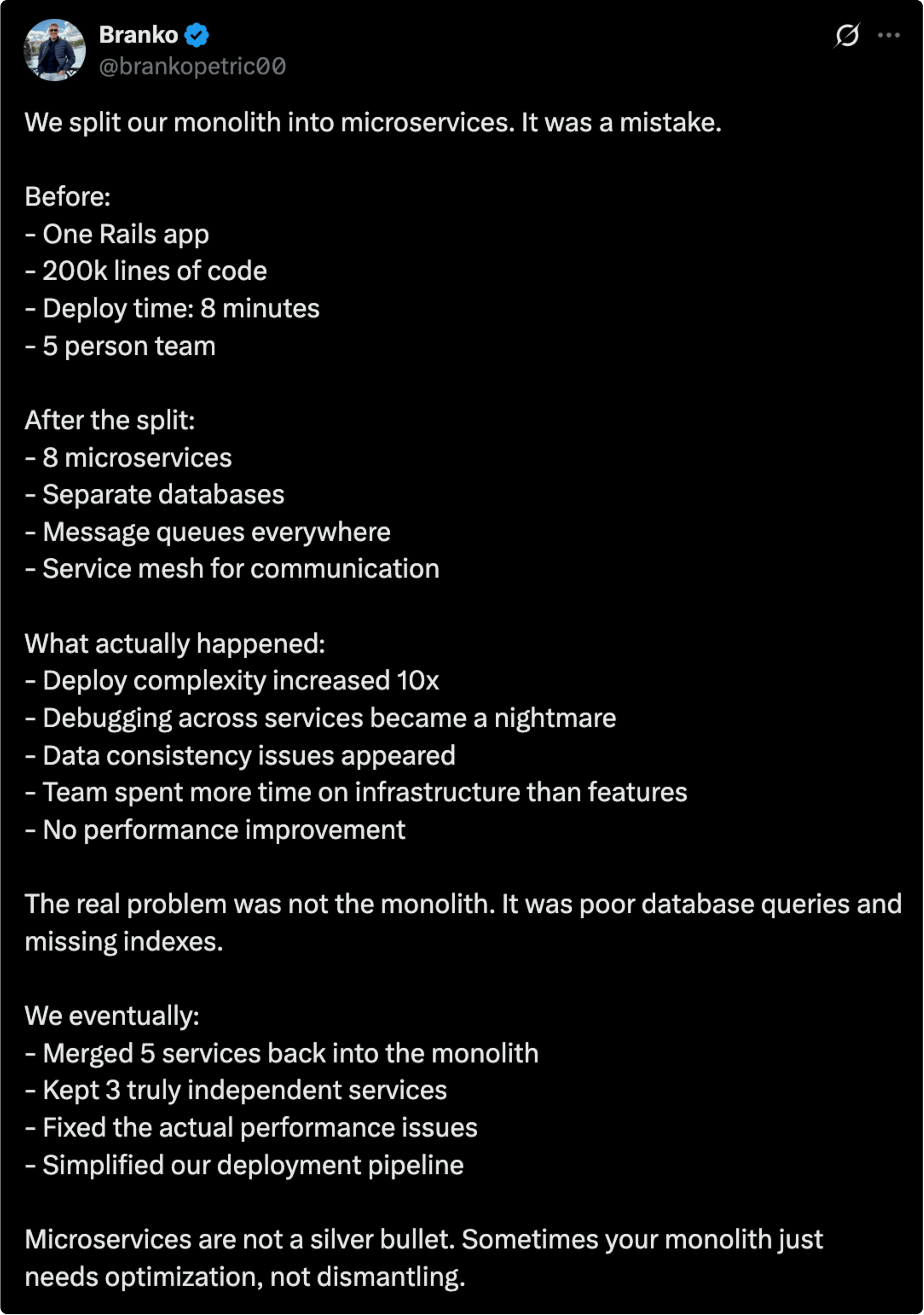 π Branko shared how splitting a monolith into microservices was a mistake in his case