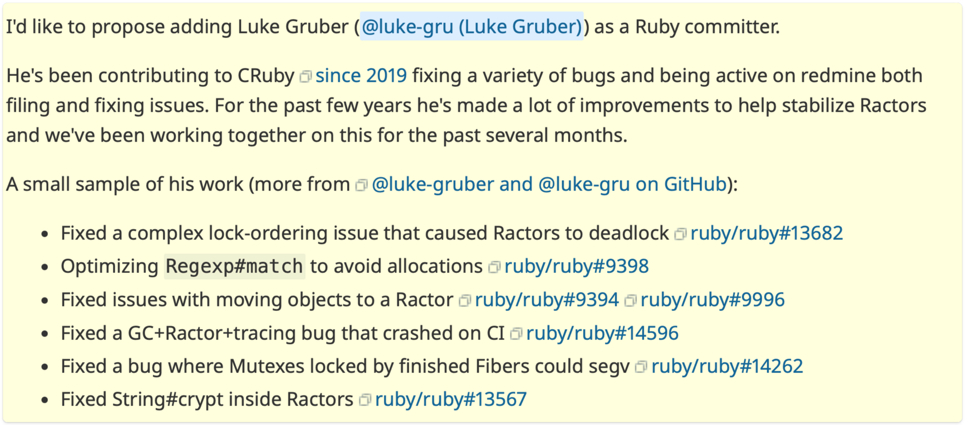 π‘ Luke Gruber was proposed to be a Ruby Core committer and Matz accepted the proposal: