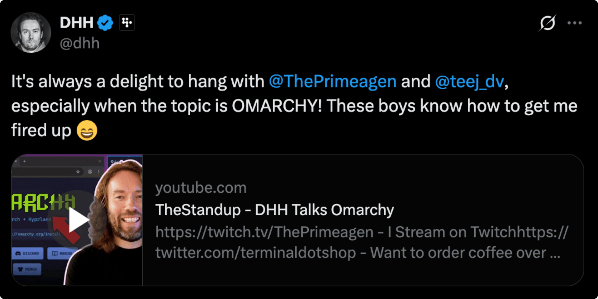 π€ David Heinemeier Hansson went on TheStandup alongside ThePrimeagen and talked about Omarchy. The video is available on YouTube.