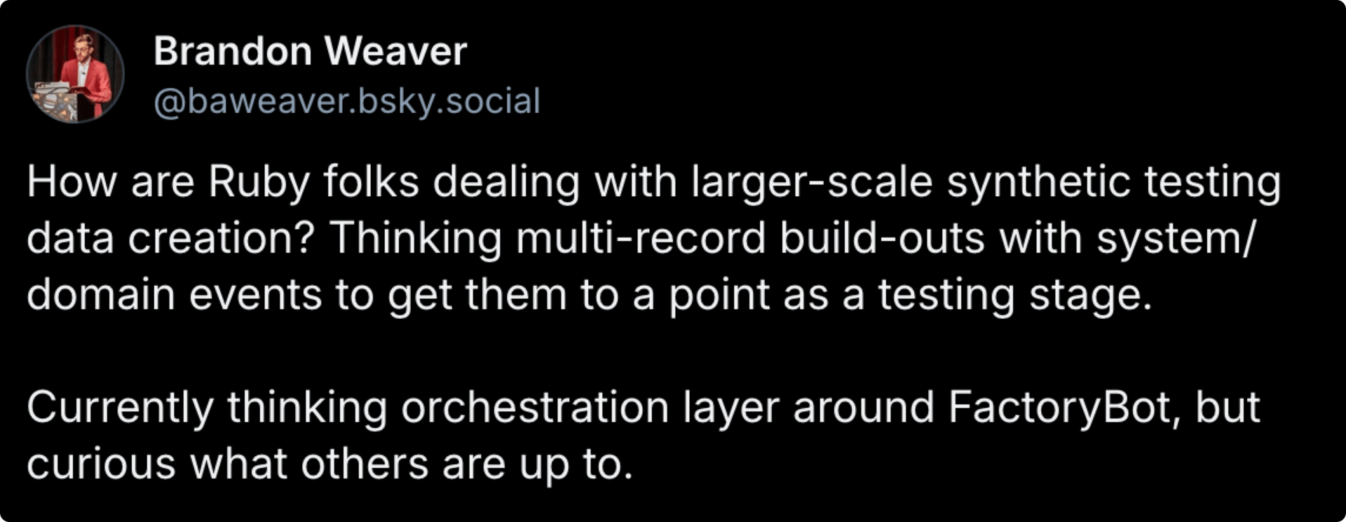 οΈπ Brandon Weaver asked about dealing with larger-scale synthetic testing data creation: