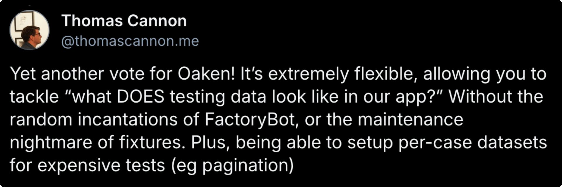 oaken β Oaken upgrades your development seeds, lets you reuse them in tests & blends the best of fixtures & factories into one cohesive whole.