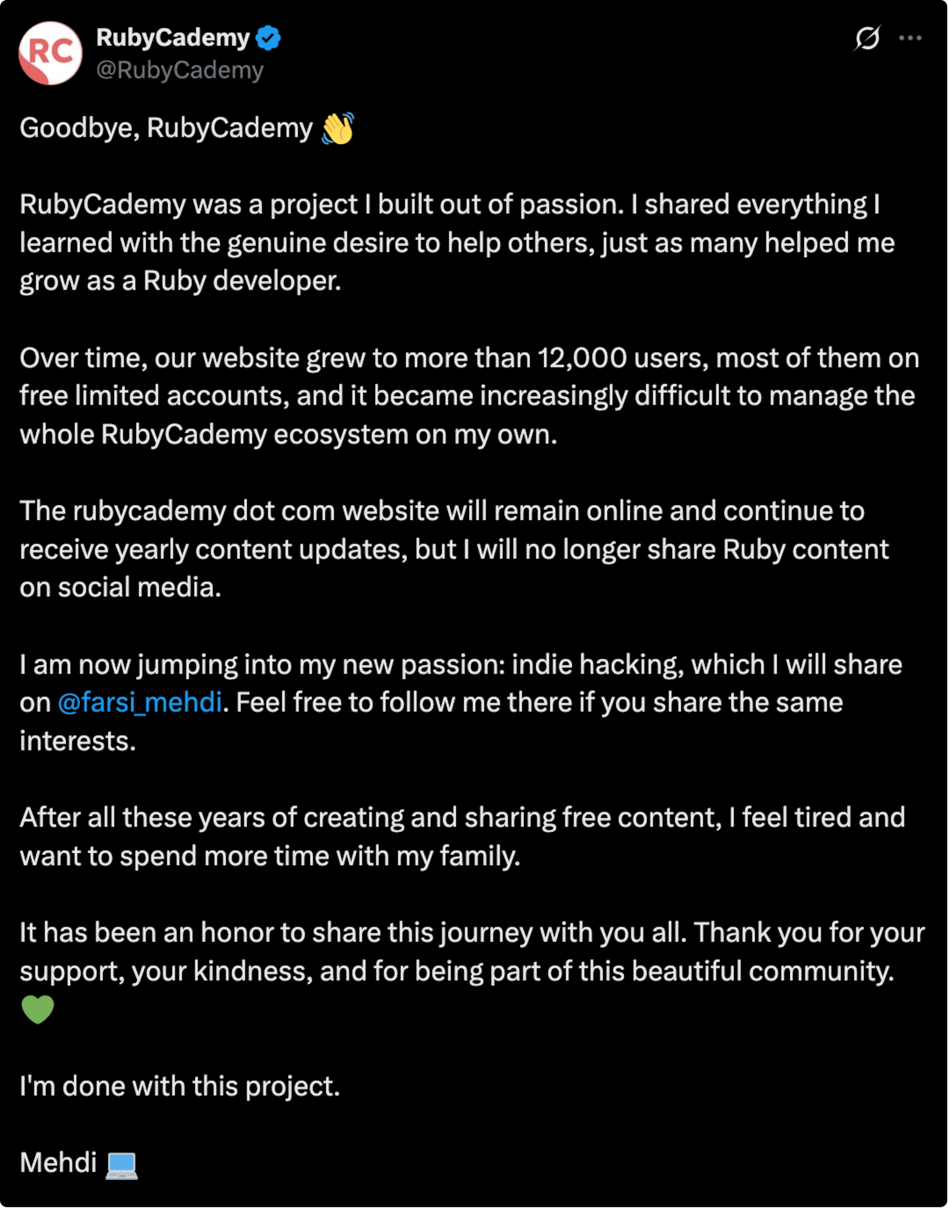 π‘ Ruby Cademy shared that the RubyCademy project is ending π₯Ή