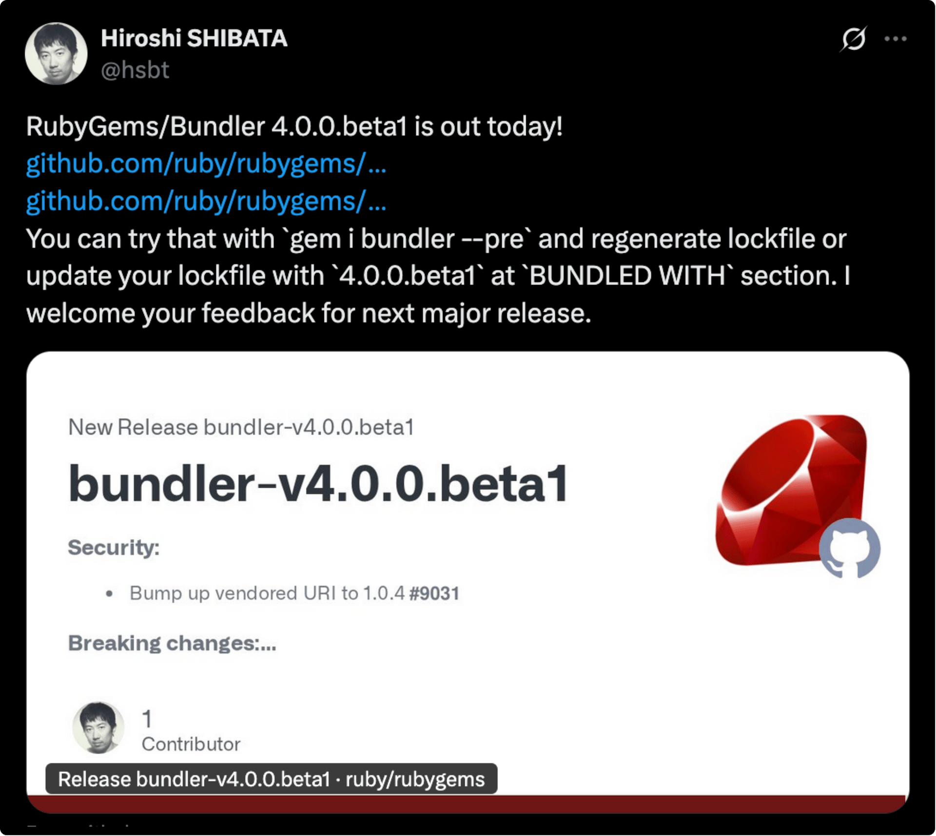 ποΈ Hiroshi Shibata announced two new releases β bundler-v4.0.0.beta1 & v4.0.0.beta1