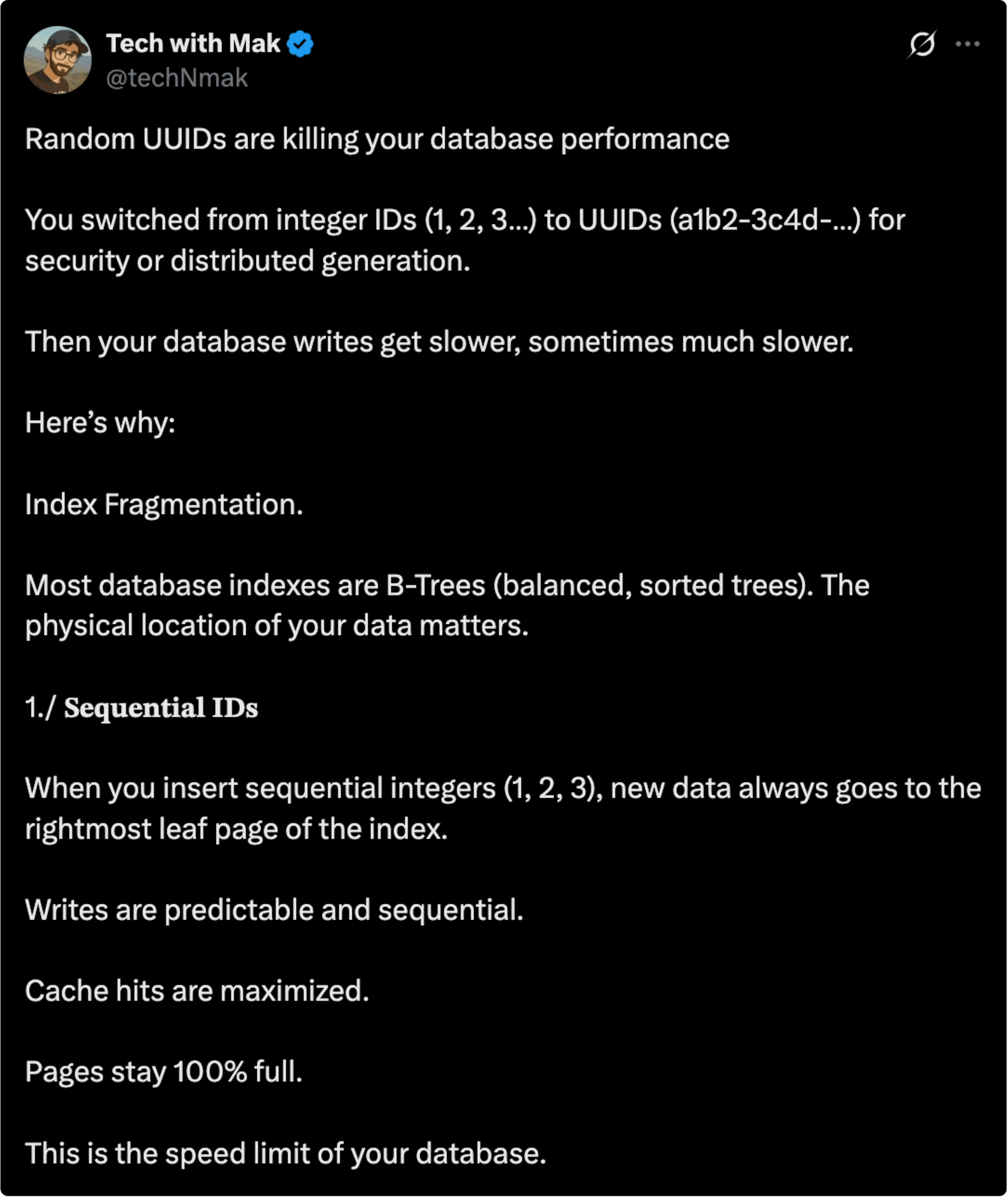 π€ Tech With Mak made a post about how random UUIDs affect database performance. Here is just a part of his post, make sure to read the thread completely.