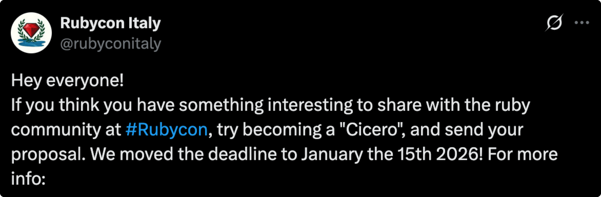 π Rubycon Italy is looking for speakers for their next yearβs event. If youβre interested, submit your talk here β CFP RubyconItaly