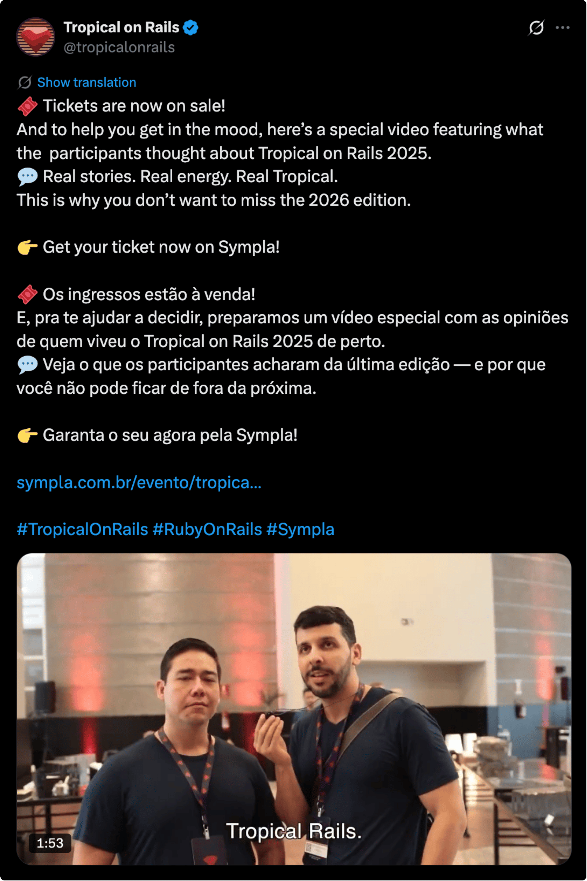π Tropical.Rb announced that tickets sales have started. If youβre interested, you can see the tickets available here β Tropical on Rails 2026 | The Brazilian Rails Conference