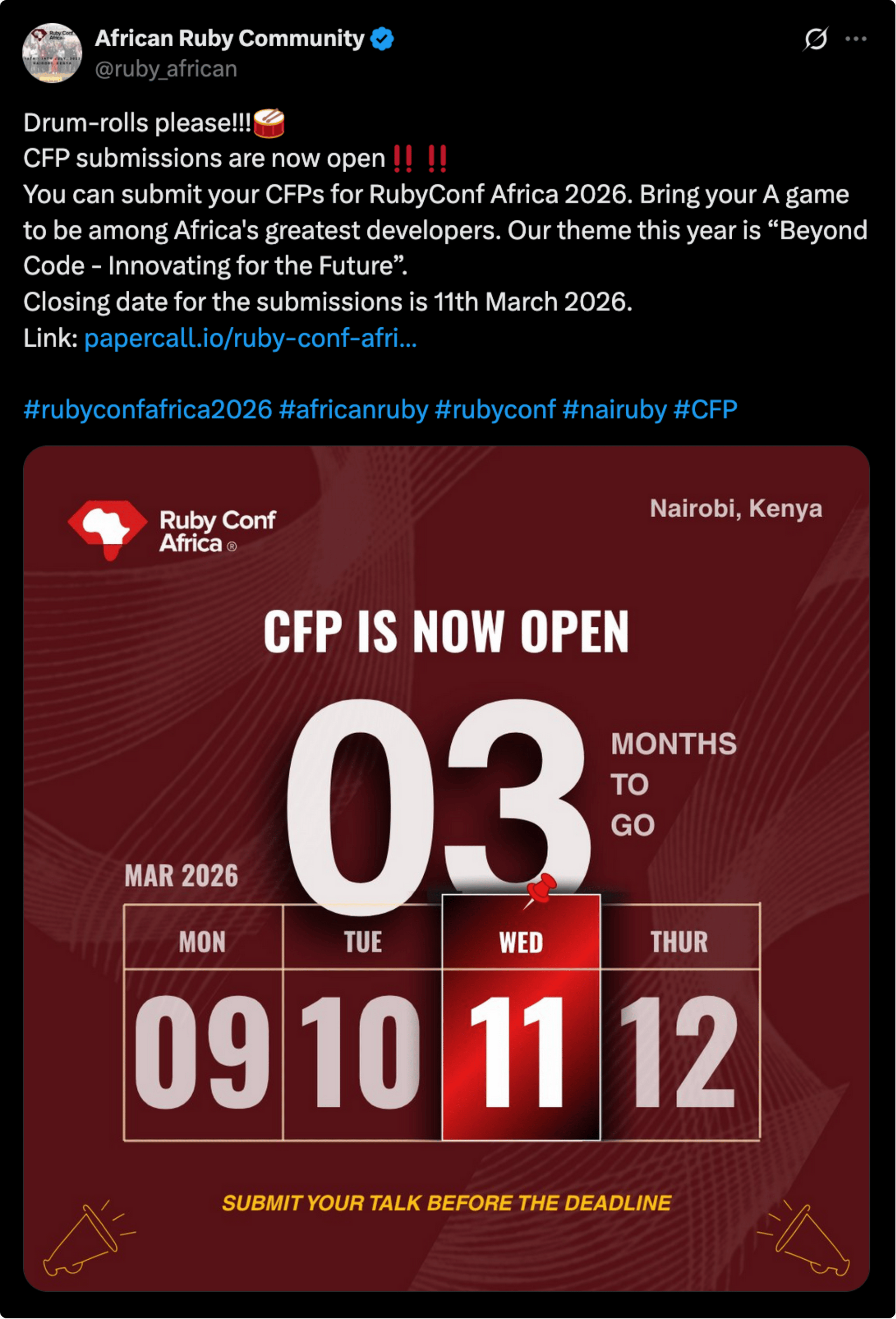 π African Ruby Community is looking for speakers for their next yearβs event. If youβre interested, submit your talk here β CFP Ruby Conf 2026