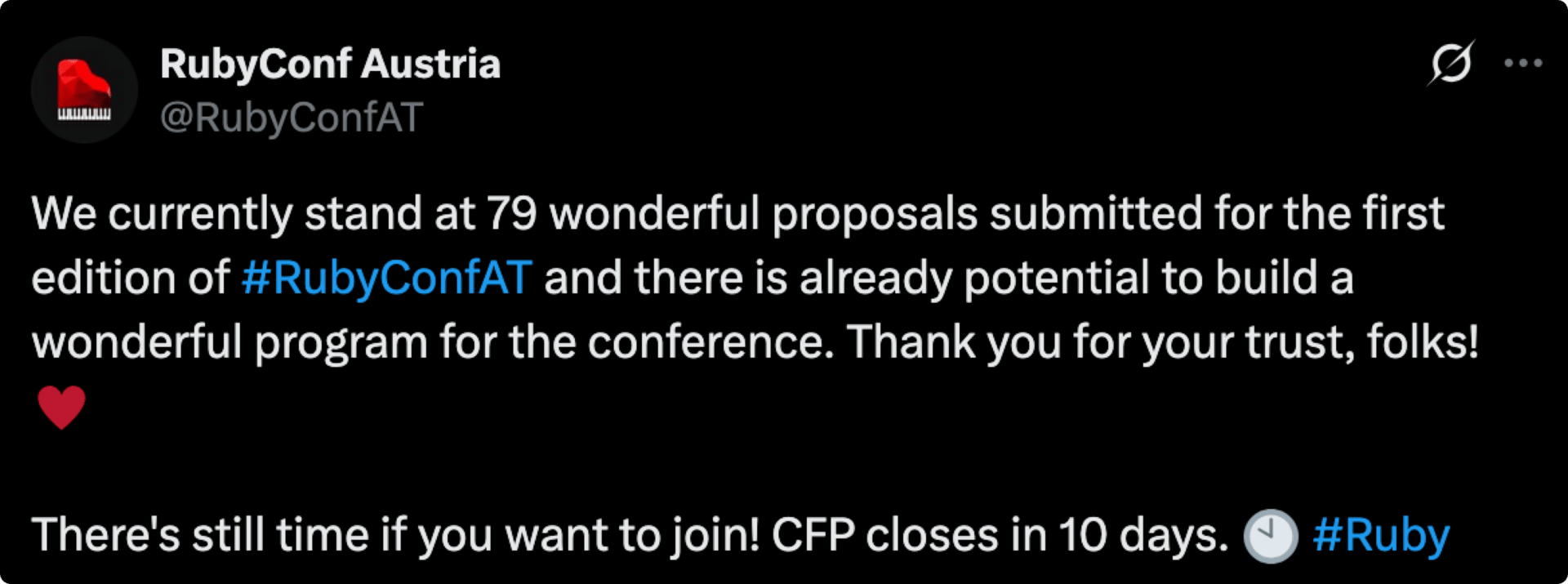π Ruby Conf Austria is looking for speakers for their next yearβs event. If youβre interested to submit your talk, hurry up, there are few days left β RubyConf Austria 2026