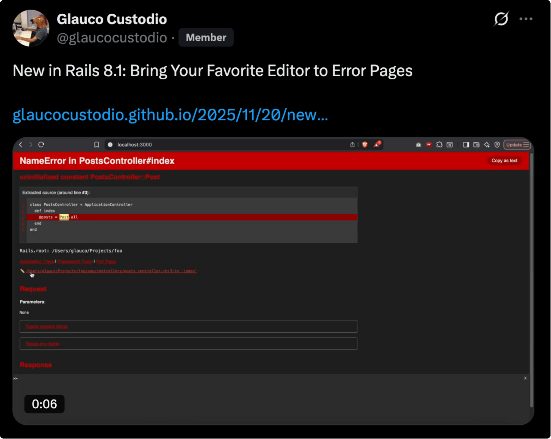 οΈπ Glauco CustΓ³dio shared a new feature in Rails 8.1. For more details, check his blog post β New in Rails 8.1: Bring Your Favorite Editor to Error Pages