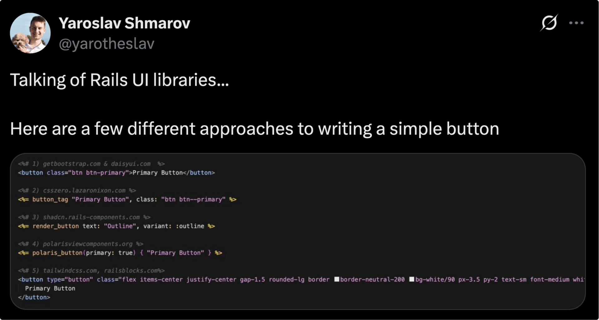 οΈπ» Yaroslav Shmarov shared different ways to write a simple button using Rails UI libraries