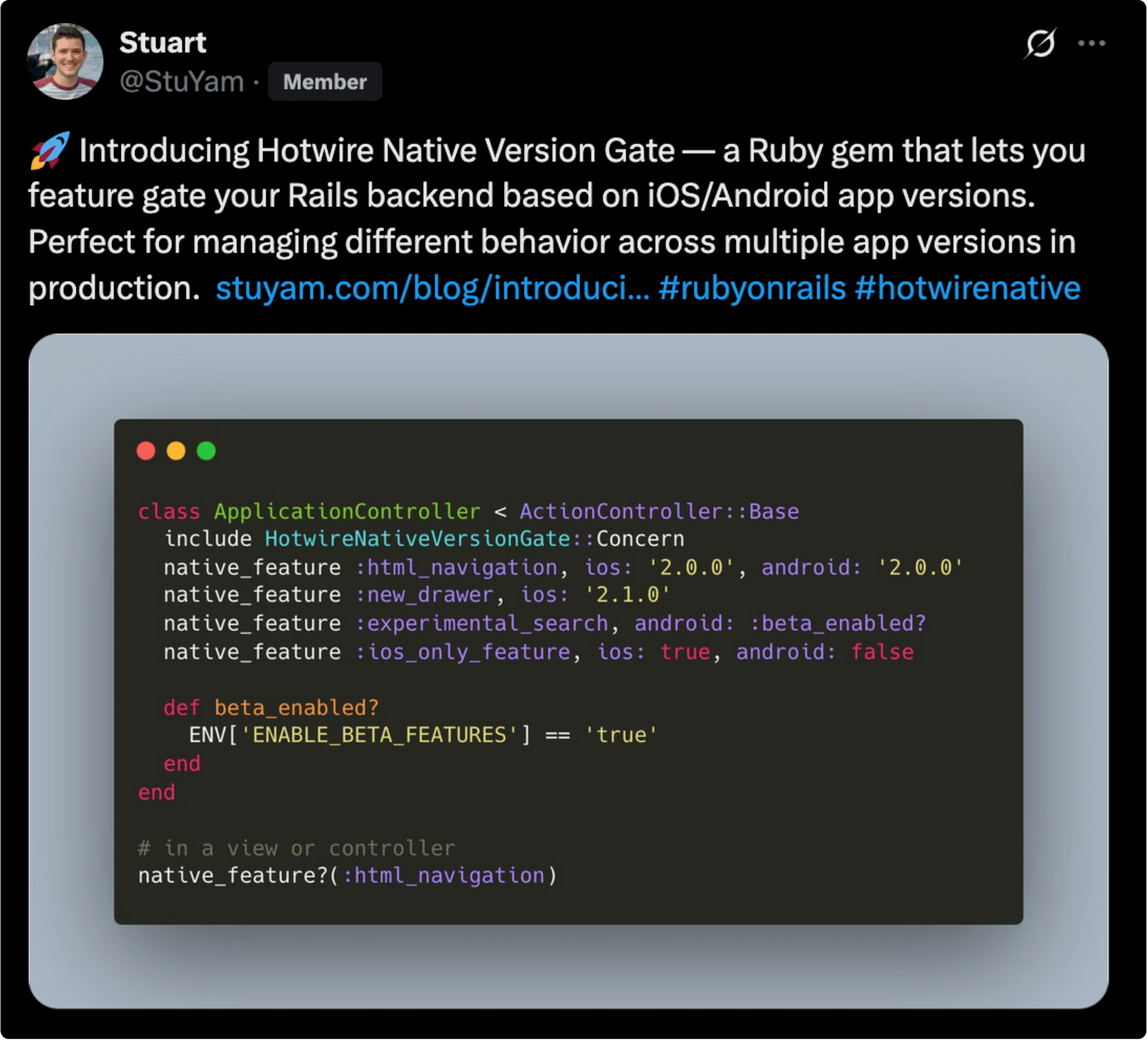 π Stuart announced a new gem β hotwire_native_version_gate - βEasy version gating for Hotwire Native Apps in Railsβ