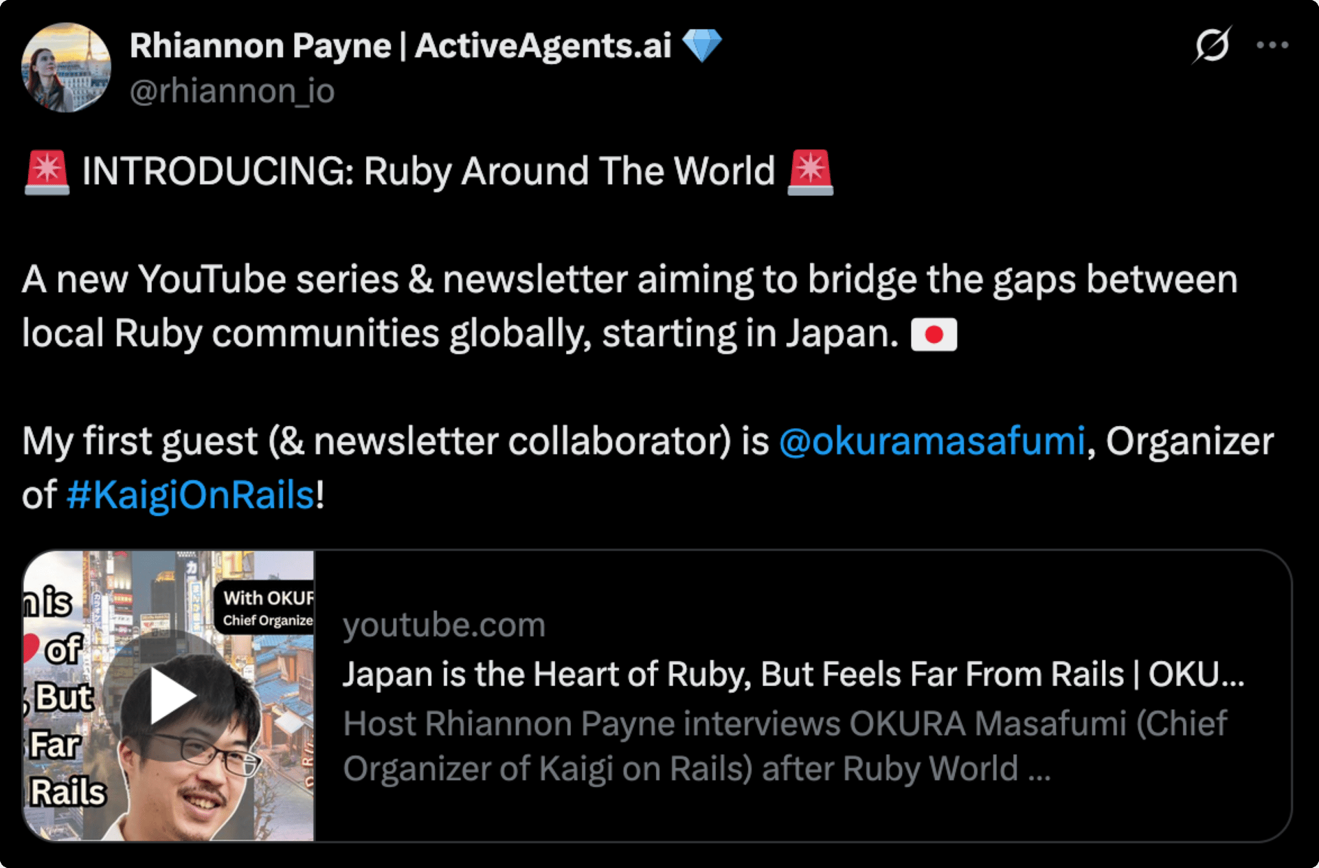 π‘ Rhiannon Payne launched a new YouTube series β Ruby Around The World. If you want to see his first video from his journey, check it right here β Japan is the Heart of Ruby, But Feels Far From Rails