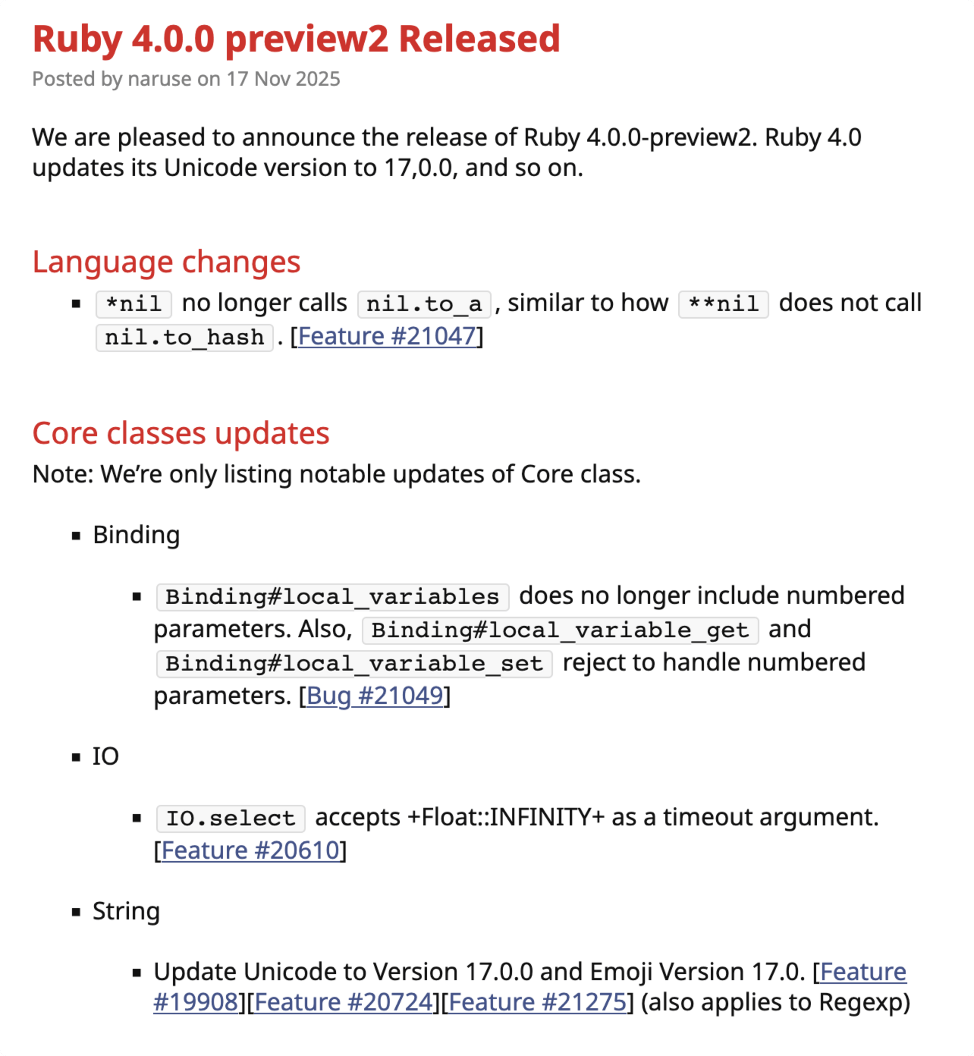 π Ruby 4.0.0 preview2 has been released. Check out the blog post for more details.