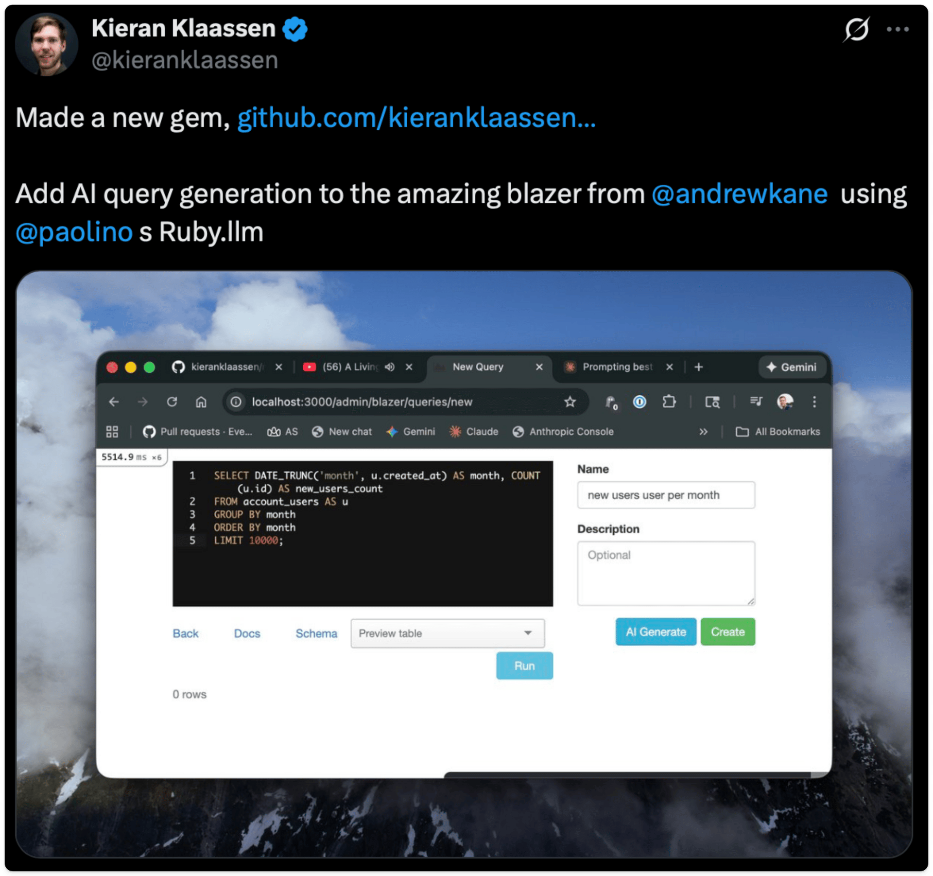 π§° Kieran Klaassen announced a new version of blazer-ai: AI-powered natural language to SQL generation for Blazer using RubyLLM