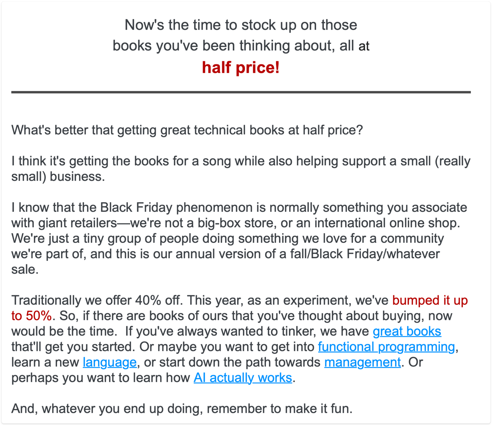 π Dave Thomas launched a discount of 50% for Pragmatic Bookshelf books β visit pragprog.com