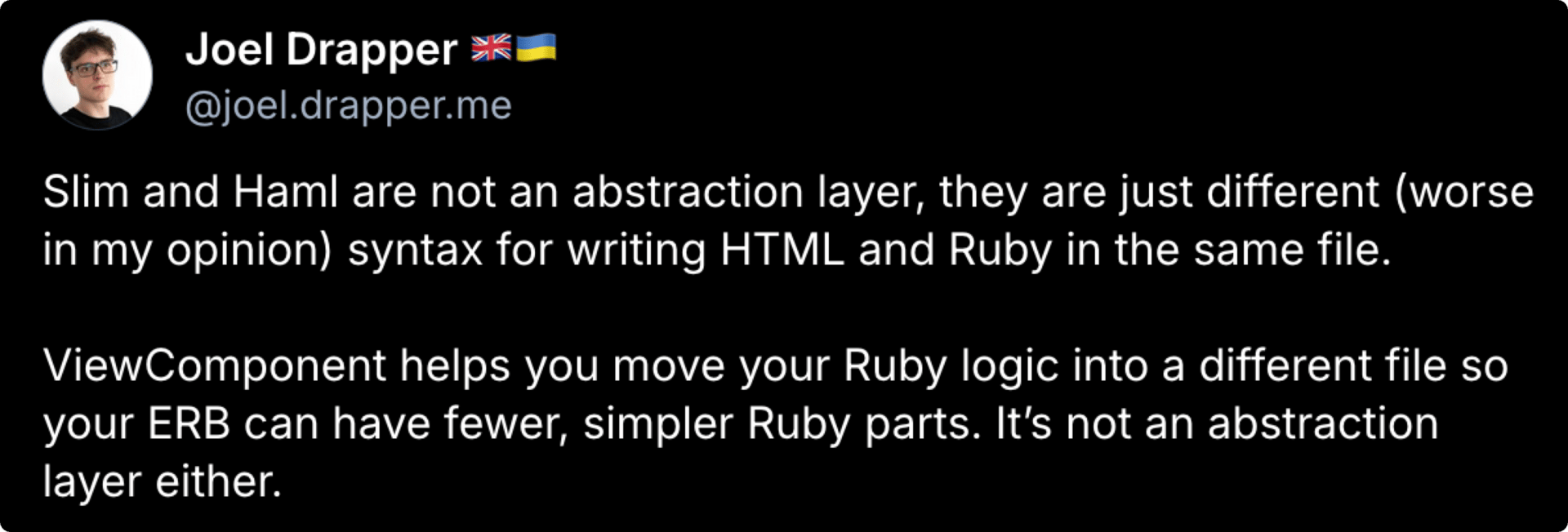 οΈπ Joel Drapper shared some words on Slim and Haml. This is just a part of his thread, we recommend to read it entirely on Skywriter.