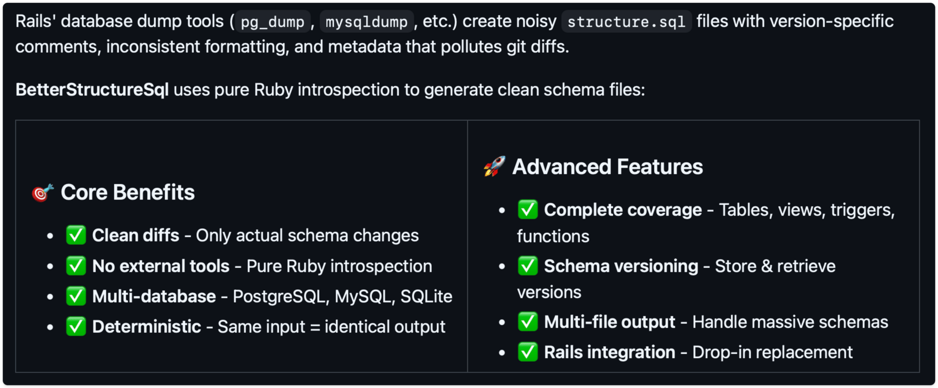 π Sebyx07 published a new gem better_structure_sql - "Pure Ruby database schema dumper for Rails applications supporting PostgreSQL, MySQL, and SQLite. Generates clean, deterministic structure.sql files without pg_dump/mysqldump/sqlite3 CLI dependencies. Supports both single-file and multi-file output for massive schemas with tens of thousands of database objects. Includes schema versioning with ZIP storage and web UI for browsing versions. "
