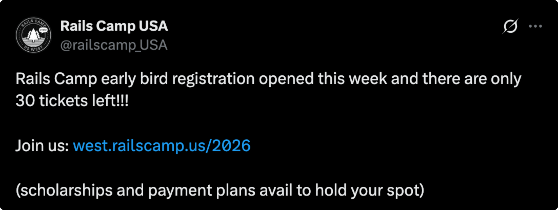 π Rails Camp Usa has opened early bird registration with only 30 tickets left. Hurry up and grab a ticket for yourself, right here β RailsCamp26