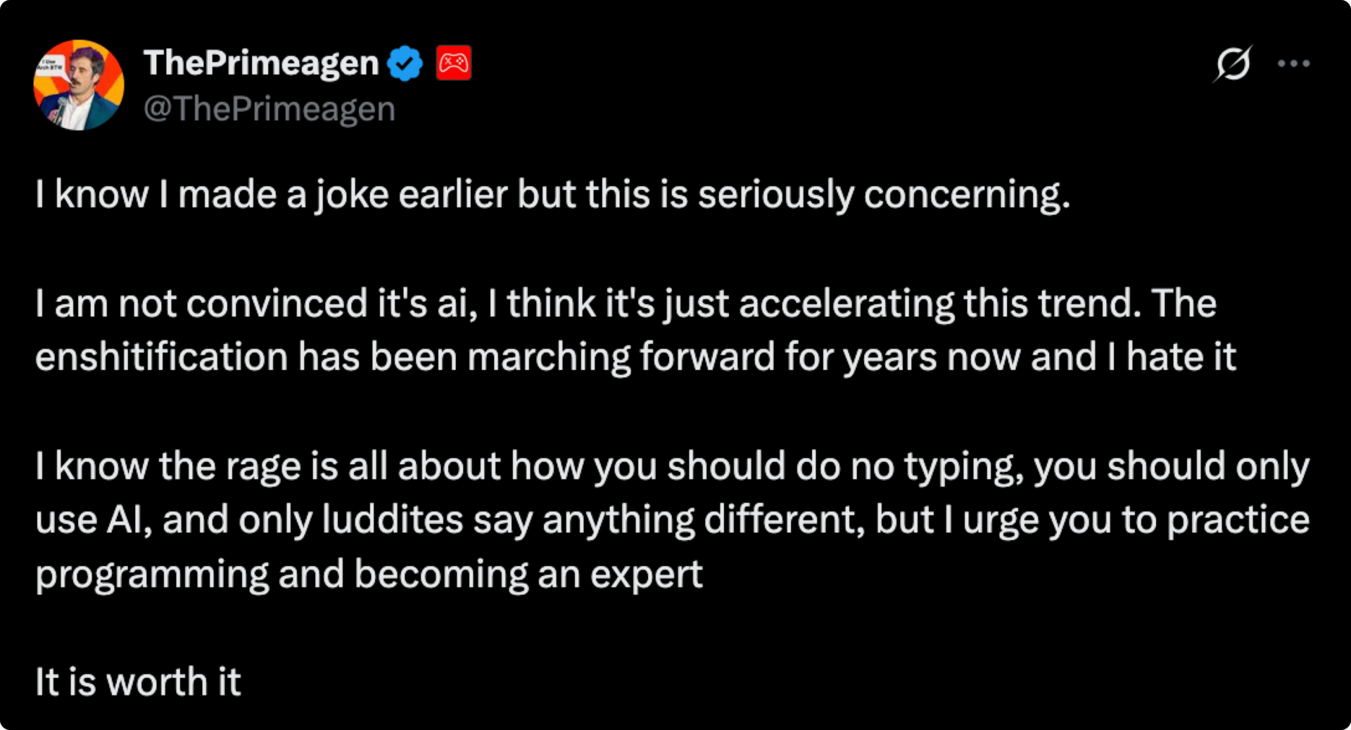 π€ The Primeagen shared his perspective on how practicing programming and becoming an expert remains crucial in this AI era