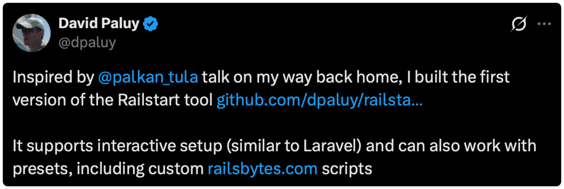 π David Paluy launched railstart - "Interactive CLI wizard for Rails app generation with customizable config"