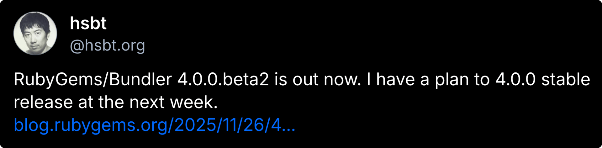 π Hiroshi Shibata announced that RubyGems/bundler 4.0.0.beta2 is available
