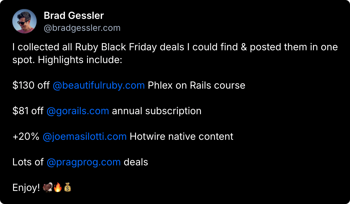 πΈ Brad Gessler shared all Ruby Black Friday deals. You can see the entire collection right here β 2025 Ruby Cyber Monday & Black Friday Deals