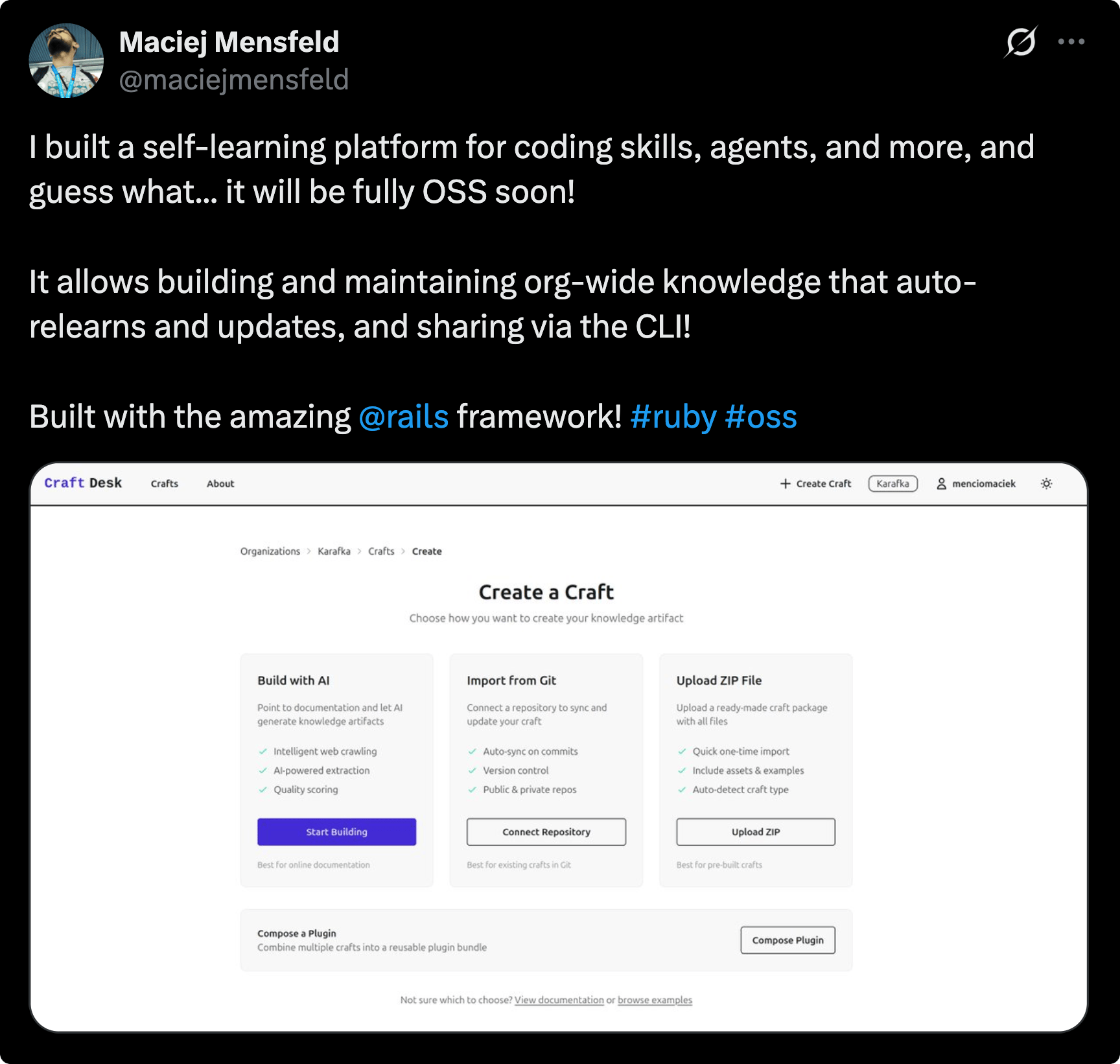 π‘ Maciej Mensfeld built a self-learning platform for coding skills and agents β craftdesk