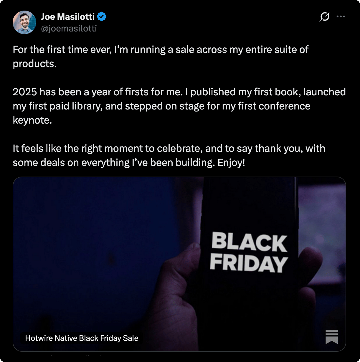 πΈ Joe Masilotti is running a Black Friday Sale across the entire Hotwire Native suite β Hotwire Native Black Friday Sale