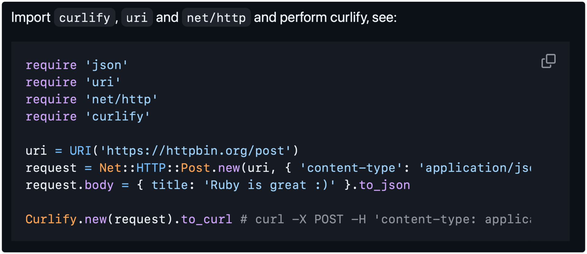 π Marcus Almeida published a new gem curlify - "Convert Ruby HTTP request and client objects into their equivalent curl command. Useful for debugging and sharing HTTP requests."