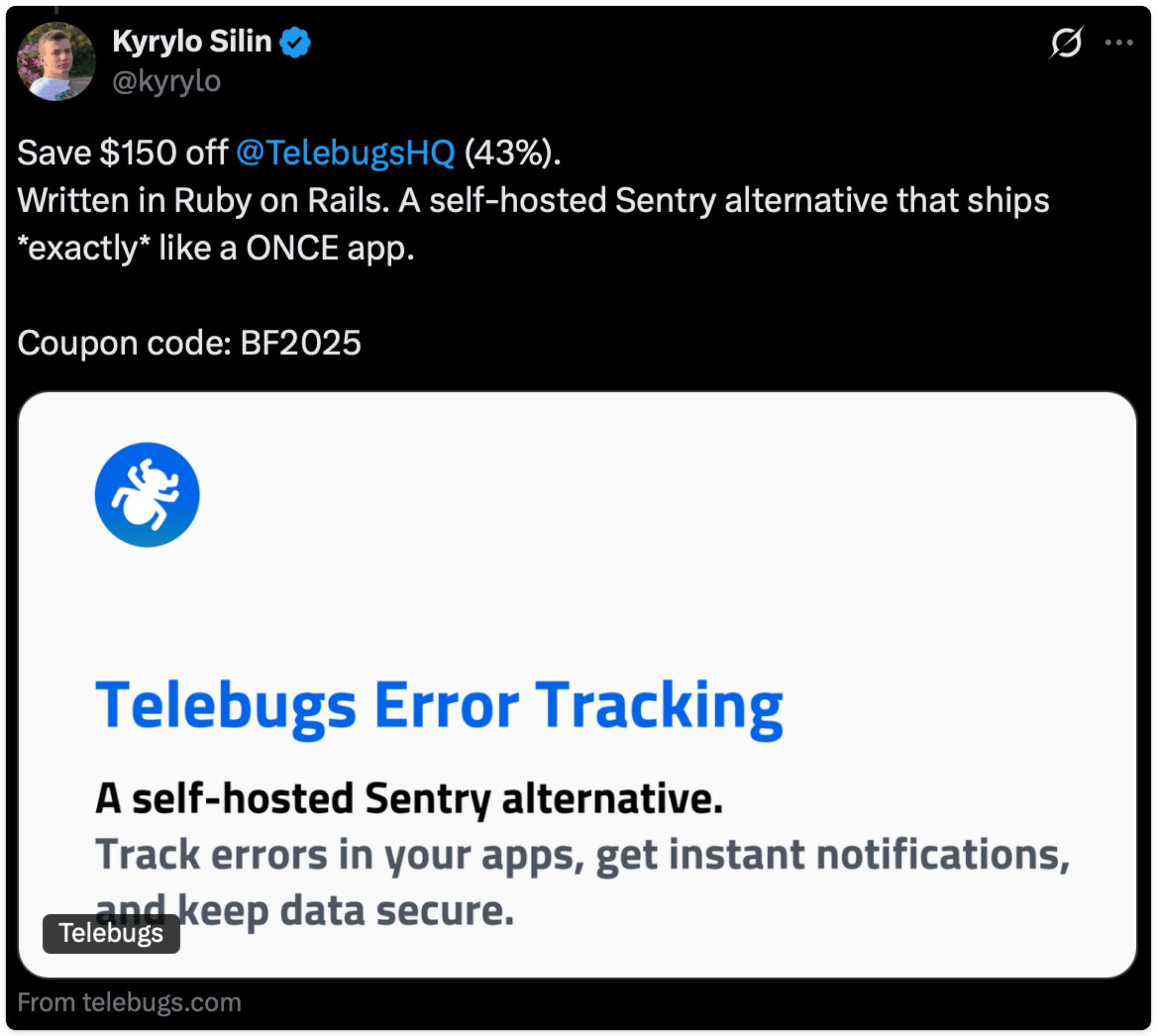 πΈ Kyrylo Silin shared a deal for Self-hosted Sentry alternative for error tracking