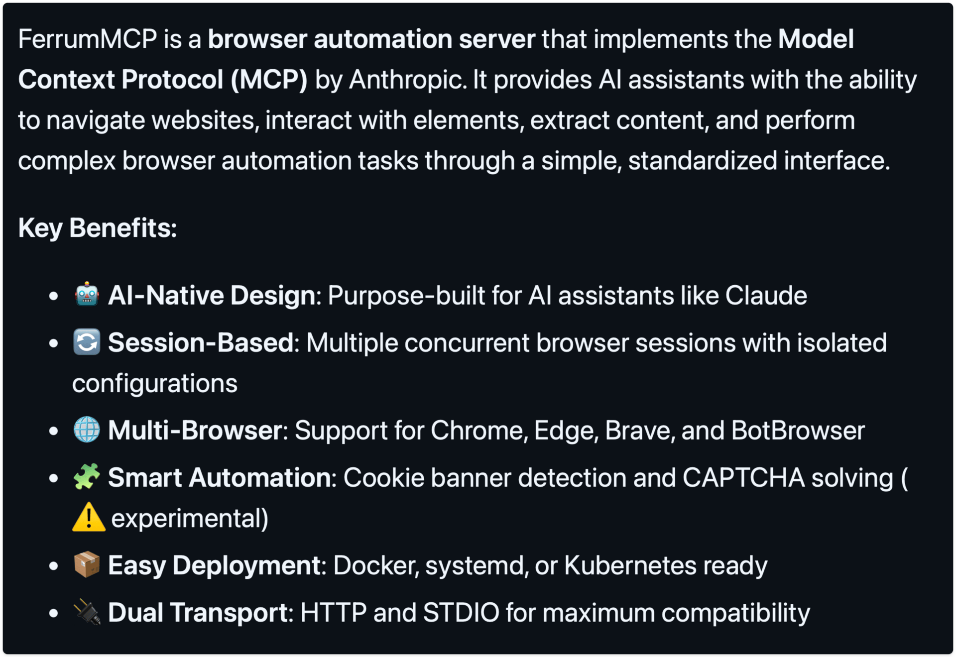 π eth3rnit3 published a new project FerrumMCP - βA Model Context Protocol (MCP) server that provides web automation capabilities through Ferrum, with optional BotBrowser integration for advanced anti-detection featuresβ