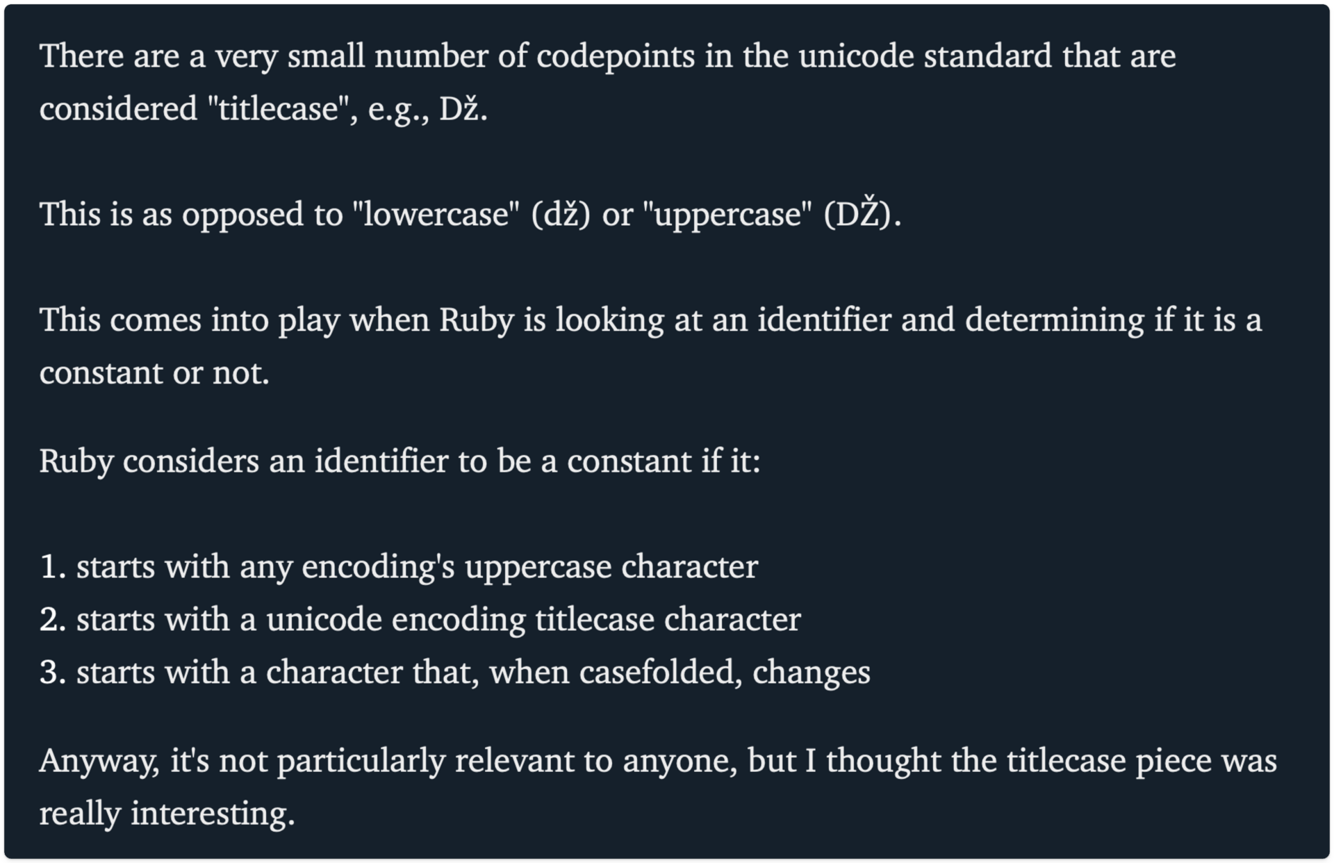 on the topic of constants in Ruby Kevin Newton shared insights about titlecase Unicode codepoints in Ruby: