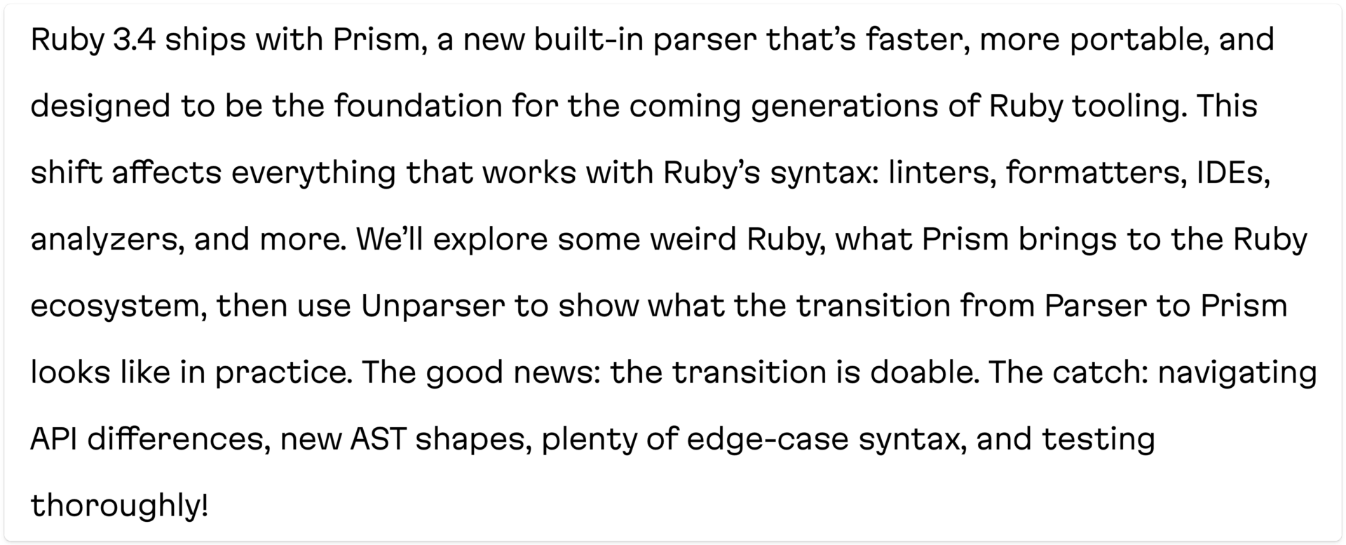 βοΈ Yaroslav Kurbatov published a new article about Unparser: real life lessons migrating Ruby tools from Parser to Prism