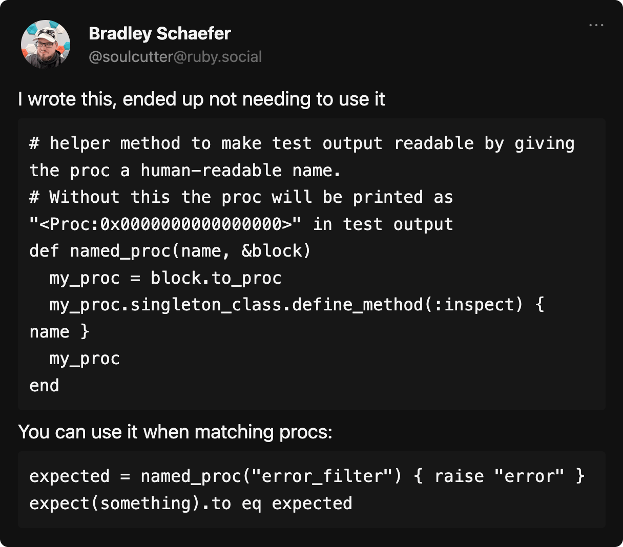 π₯οΈ Bradley Schaefer shared a helper method to make Ruby procs readable in test output