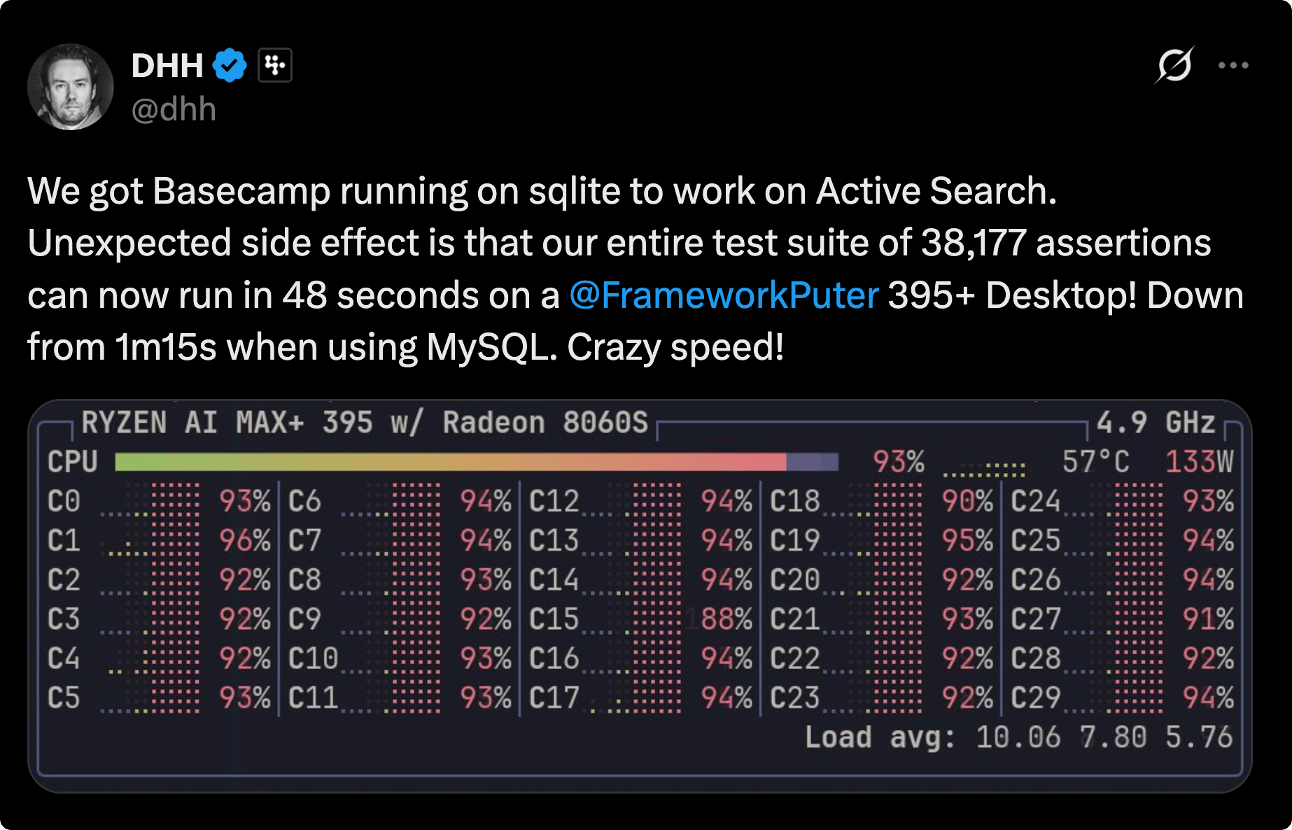 οΈοΈπ David Heinemeier Hansson shared that Basecamp's test suite runs in 48 seconds on SQLite, down from over a minute with MySQL