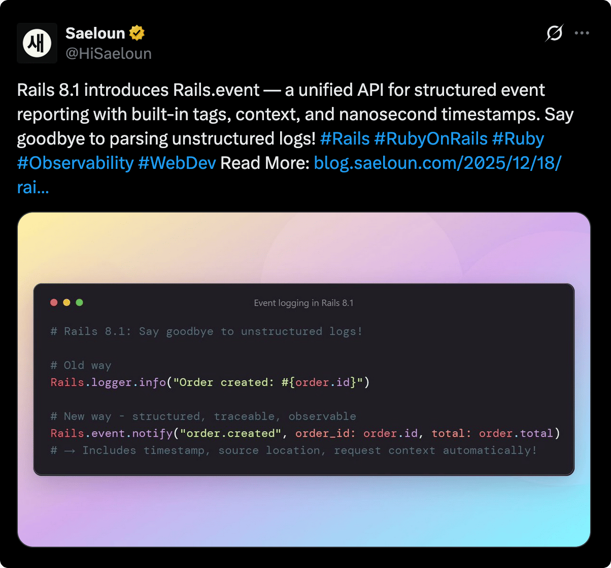 π» Saeloun shared a code sample about Rails.event. For more details, check the blog post version β Rails 8.1 Introduces Structured Event Reporting with Rails.event