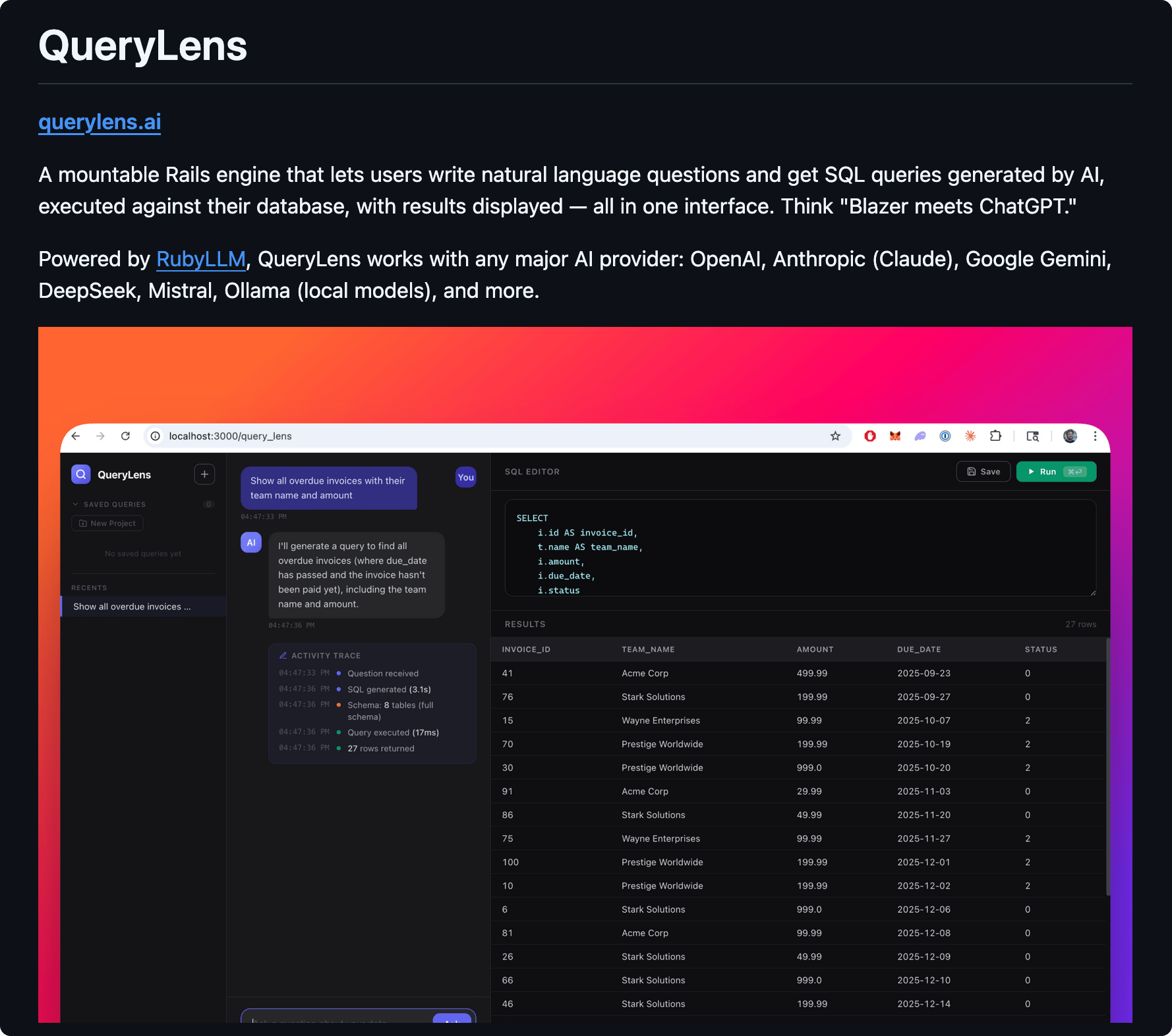 π Bryan Beshore created query_lens - βNatural language SQL query builder for Rails, powered by AIβ