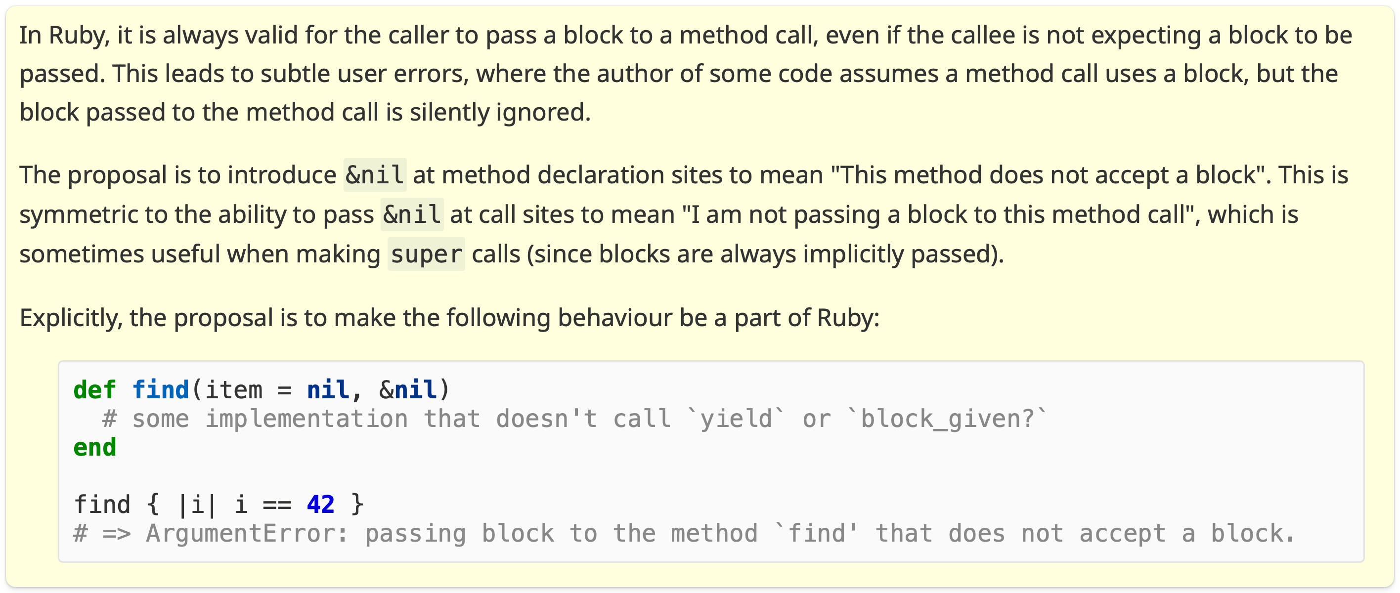 π A proposal from Ufuk Kayserilioglu about Allow methods to declare that they don't accept a block via &nil has also been merged to master: