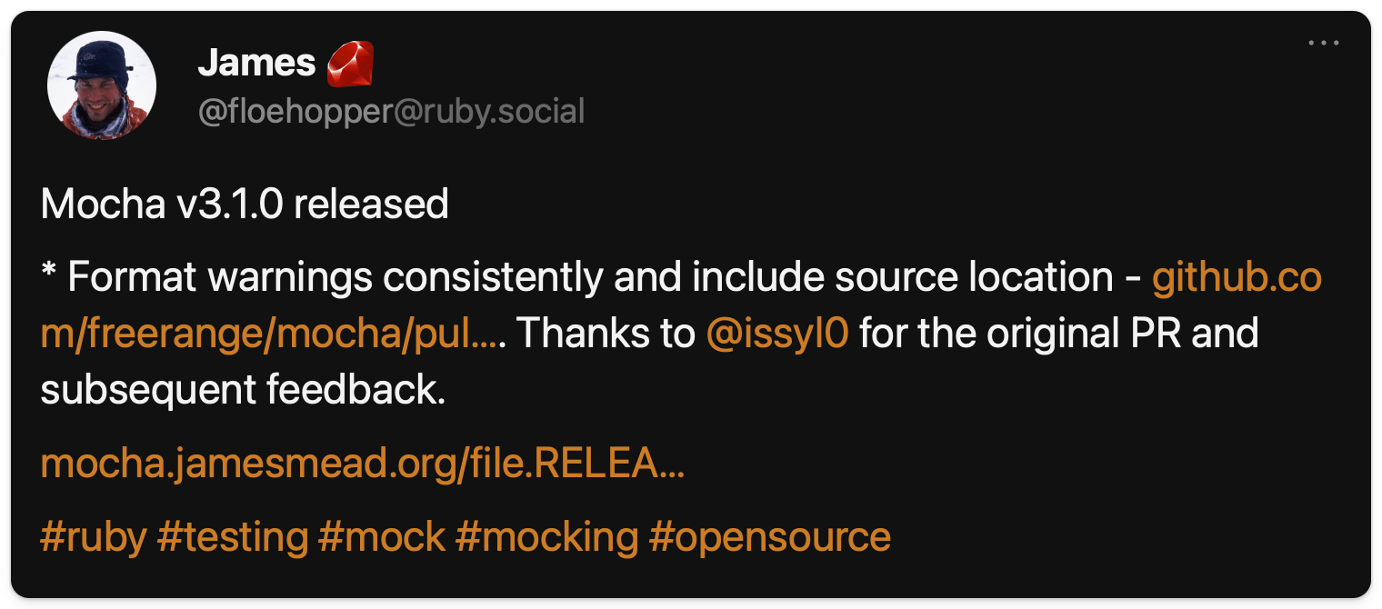 π§° James announced a new version of Mocha 3.1.0 β Format warnings consistently and include source location by floehopper Β· Pull Request #794